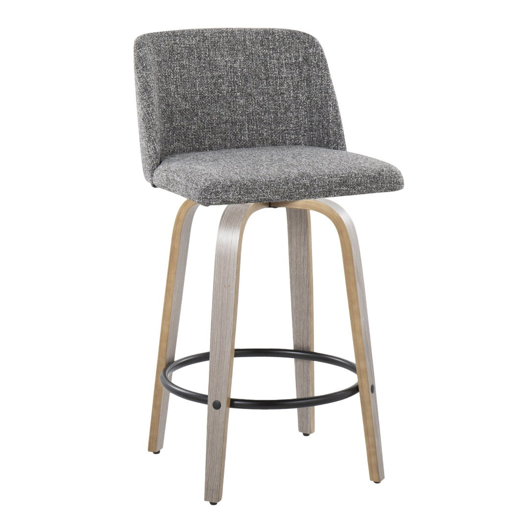 Enjoy contemporary comfort and modern simplicity with this set of two Toriano counter stools. Designed for everyday use, each stool pairs a padded, swivel-upholstered seat with light grey wood legs and a round black metal footrest for a clean, transitional look that complements kitchens, islands, and counters.