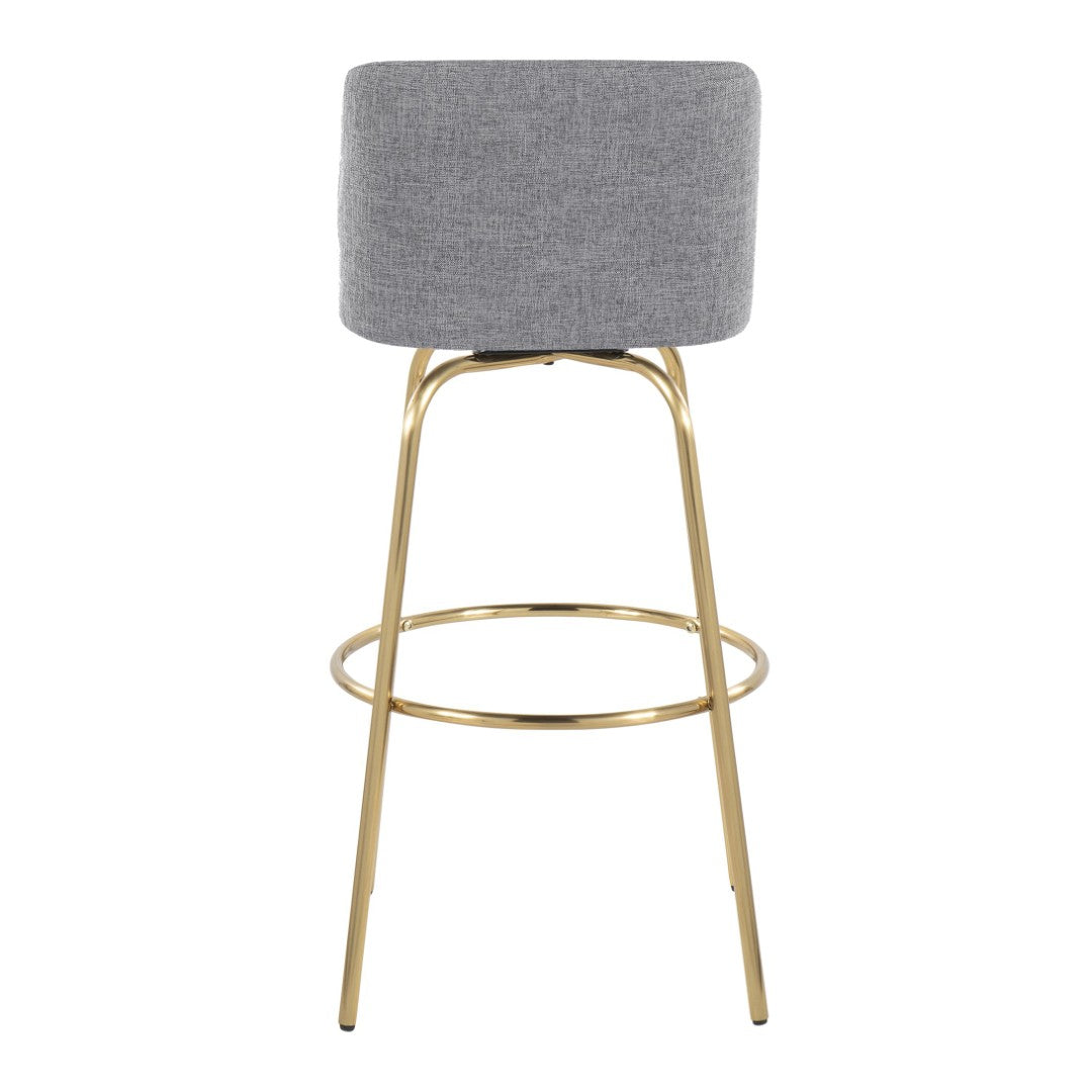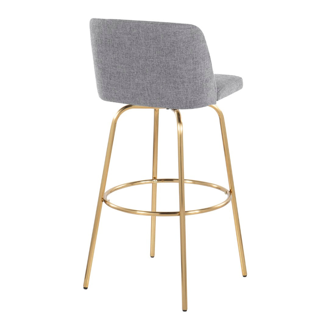 Brighten your kitchen or bar area with the Toriano — a contemporary, compact barstool that pairs modern simplicity with plush comfort. Its padded grey fabric seat and 360° swivel deliver relaxed seating and ease of conversation, while the gold metal base and round footrest add a chic, upscale touch. Perfect for small spaces and paired seating, this set of two barstools balances style and everyday durability.