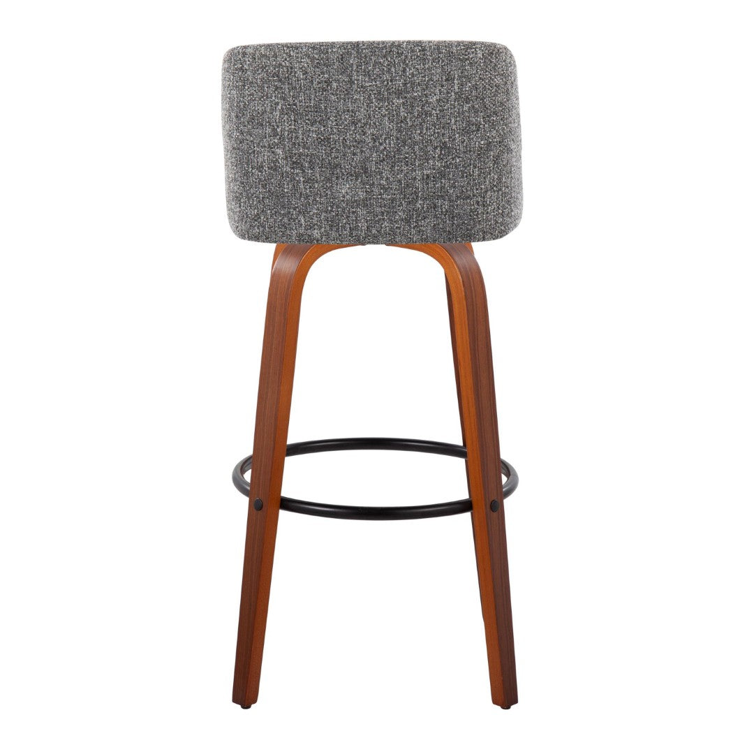 Brighten your kitchen or bar area with the Toriano barstool — a mid-century modern piece that combines comfort, clean lines, and functional swivel seating. Upholstered in durable Grey Noise fabric and supported by warm walnut-finished bent wood legs, this fixed-height stool delivers a refined, cohesive look for modern and transitional interiors. Sold in a set of two, it’s designed for everyday use with a built-in round black metal footrest for added comfort.