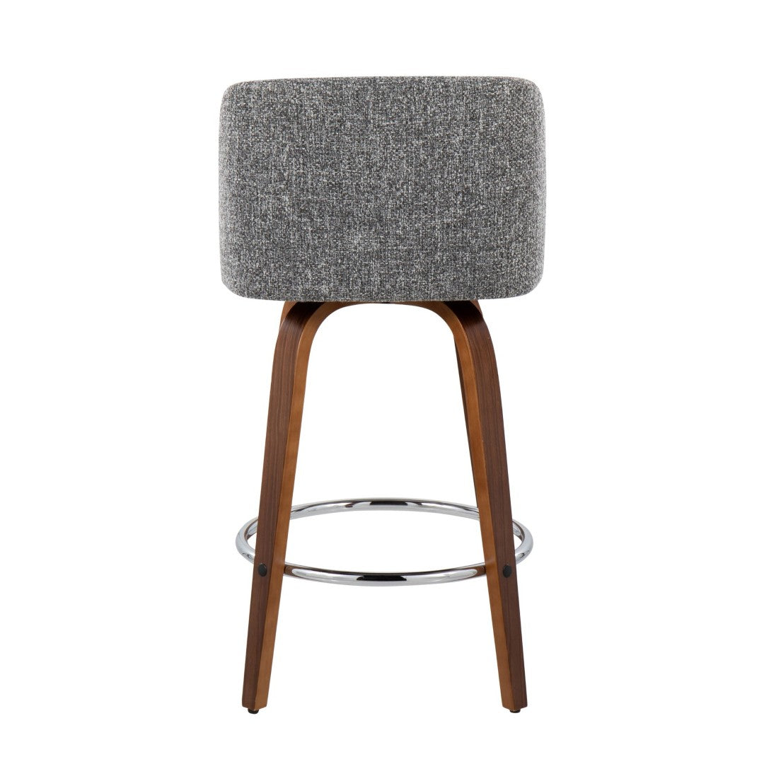 Upgrade your kitchen or bar area with the Toriano counter stool—a mid-century modern piece that blends classic lines with contemporary comfort. Designed for everyday use, its padded swivel seat, walnut-finished bent wood legs, and chrome round footrest offer both style and stability. Sold as a pair, these stools are ideal for creating a coordinated look in small or open-plan spaces.
