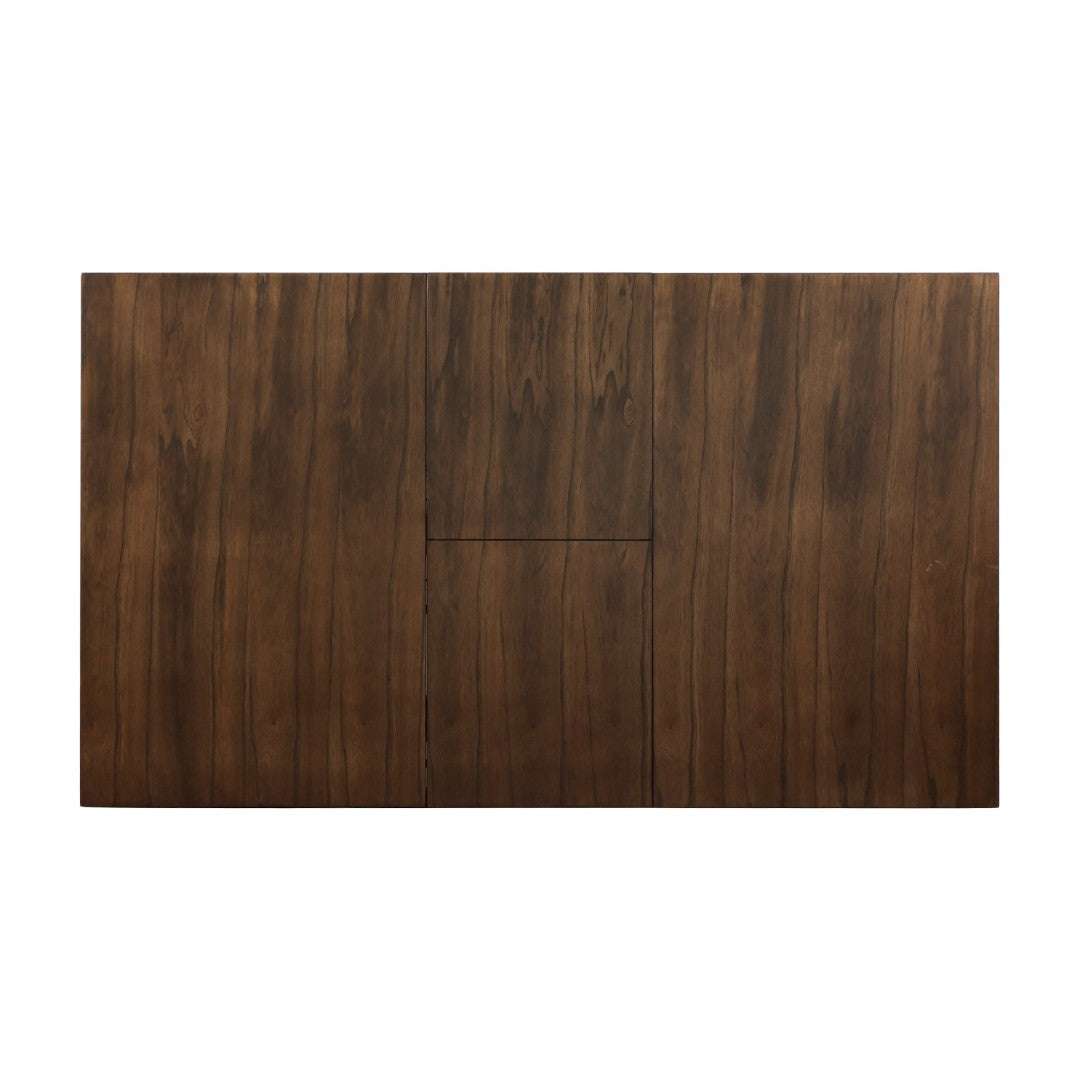 - Table features: Trestle base with Mindy veneer top, butterfly (self-storing) leaf that tucks beneath the tabletop for easy expansion, and apron construction for stability.