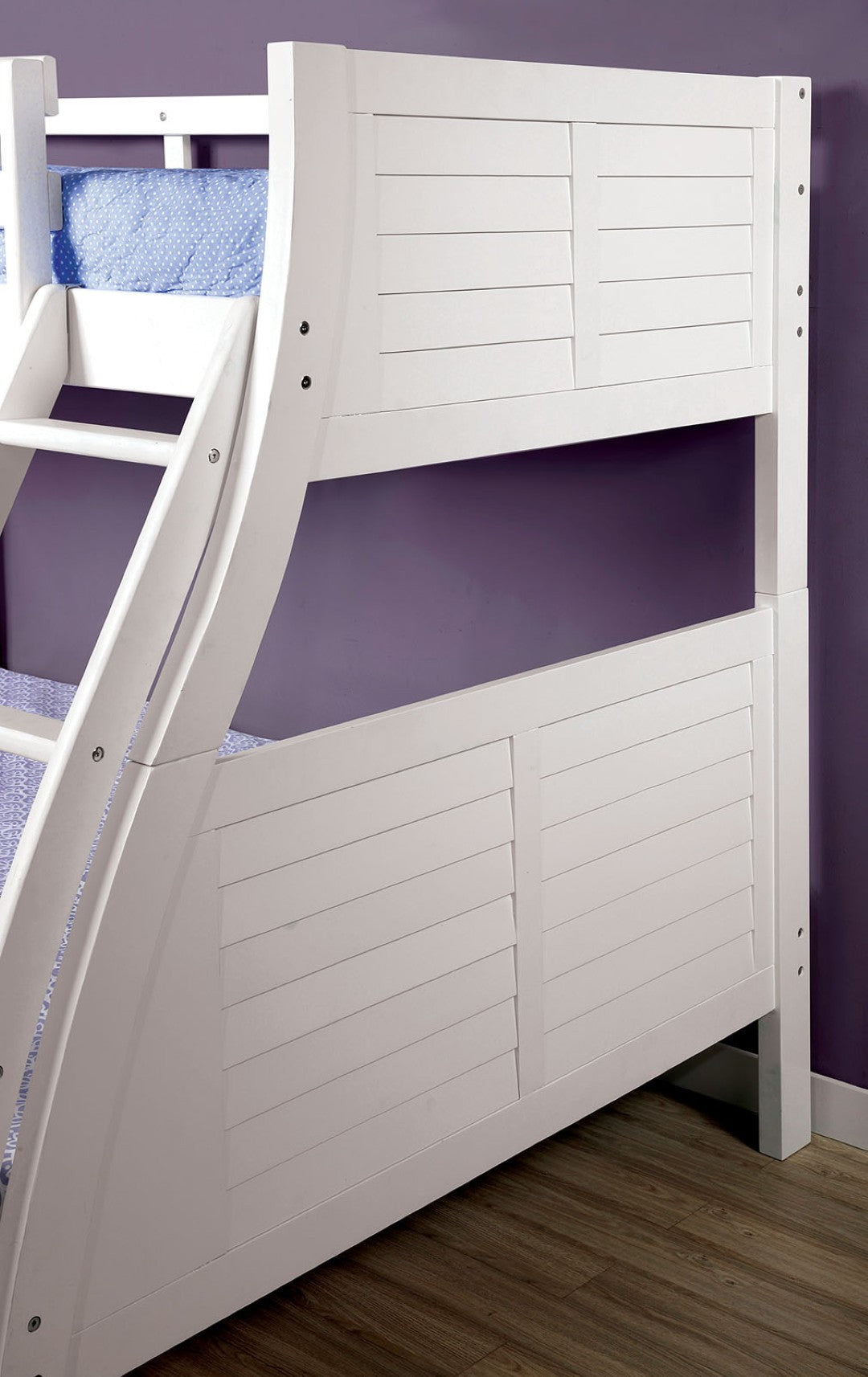 This transitional twin-over-full bunk bed combines timeless plank styling with practical safety and versatility, making it ideal for growing children and teens. Finished in crisp white, it fits both classic and contemporary decors while maximizing sleeping space and offering durable construction for everyday use.