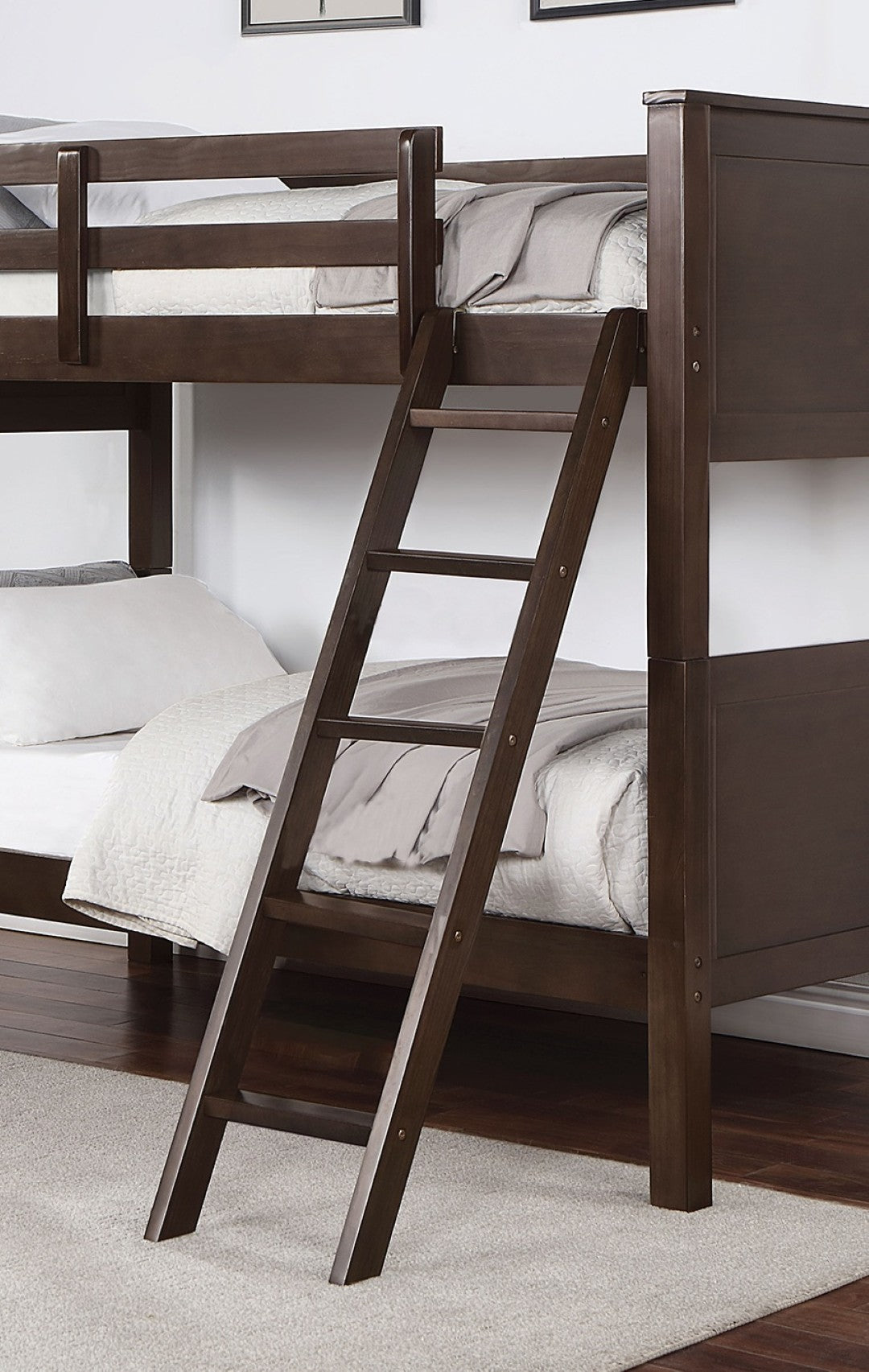 This twin-over-twin bunk bed blends timeless transitional styling with practical features to maximize space and versatility in bedrooms, guest rooms, or vacation rentals. Solid-looking walnut finish, angled ladder and safety rails deliver a classic look while providing secure, mattress-ready platforms for both upper and lower beds. Designed for flexible living, the two beds can be separated and used as independent twin beds to suit changing needs.