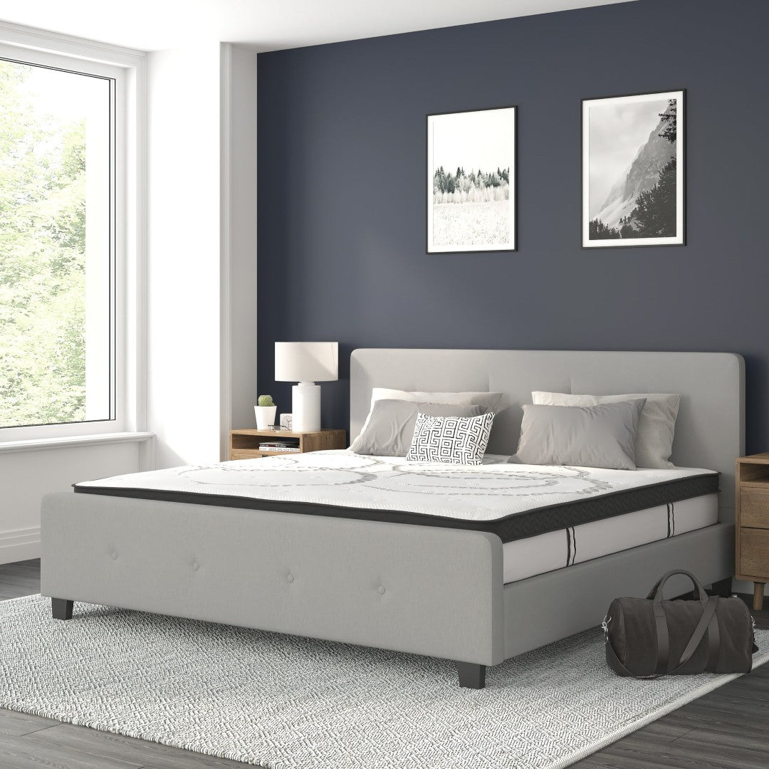 Give your bedroom an updated, relaxed look with this modern tufted platform bed and included 10" CertiPUR‑US certified pocket spring mattress. The clean black fabric upholstery and button-tufted headboard/footboard create a tailored yet casual aesthetic that fits a variety of decor styles. Built as a platform bed with supportive slats and center leg, it removes the need for a box spring and pairs with a responsive, motion-isolating mattress ideal for couples or light sleepers. Easy to assemble and shipped boxed, the mattress expands to full shape within 48–72 hours after unboxing.