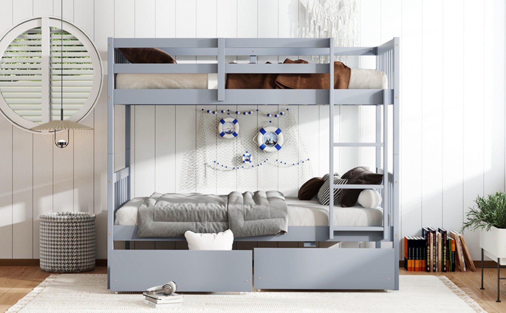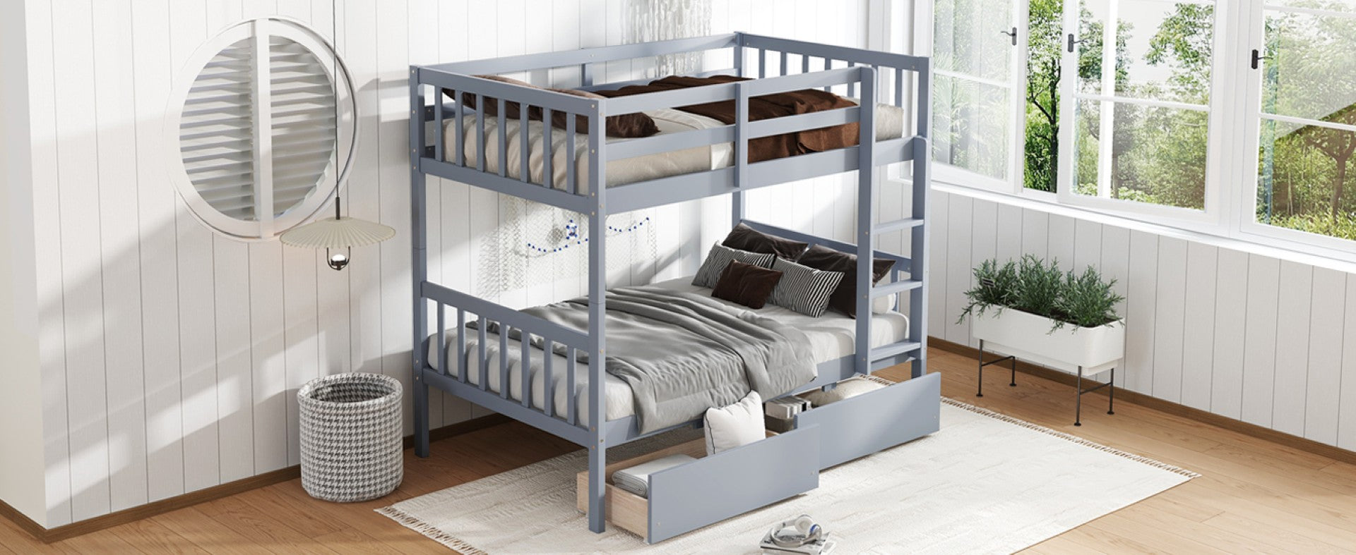 - Storage: Two built-in drawers beneath the lower bunk provide concealed storage for bedding, clothing, or toys to maximize floor space.