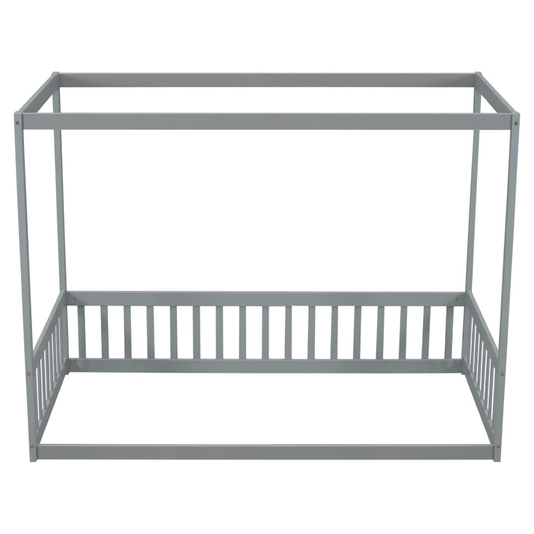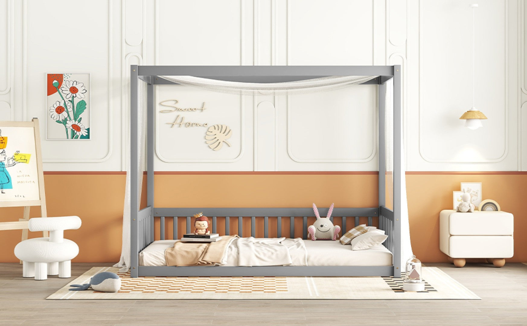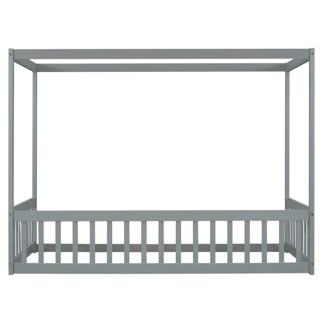 Transform your child's bedroom into a cozy, imaginative retreat with this twin canopy floor bed. Clean lines and a soft grey finish create a modern, versatile piece that encourages play and storytelling while providing a safe, low-to-the-ground sleeping solution. Crafted from pine and plywood, the design includes guardrails and a fence-style surround for added security and visual charm—perfect for growing rooms or play spaces.