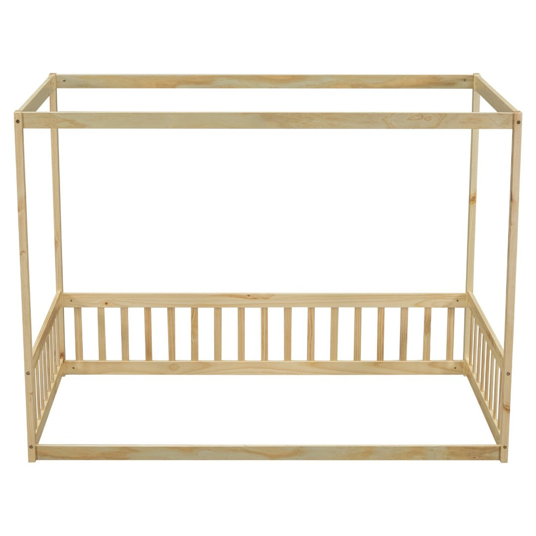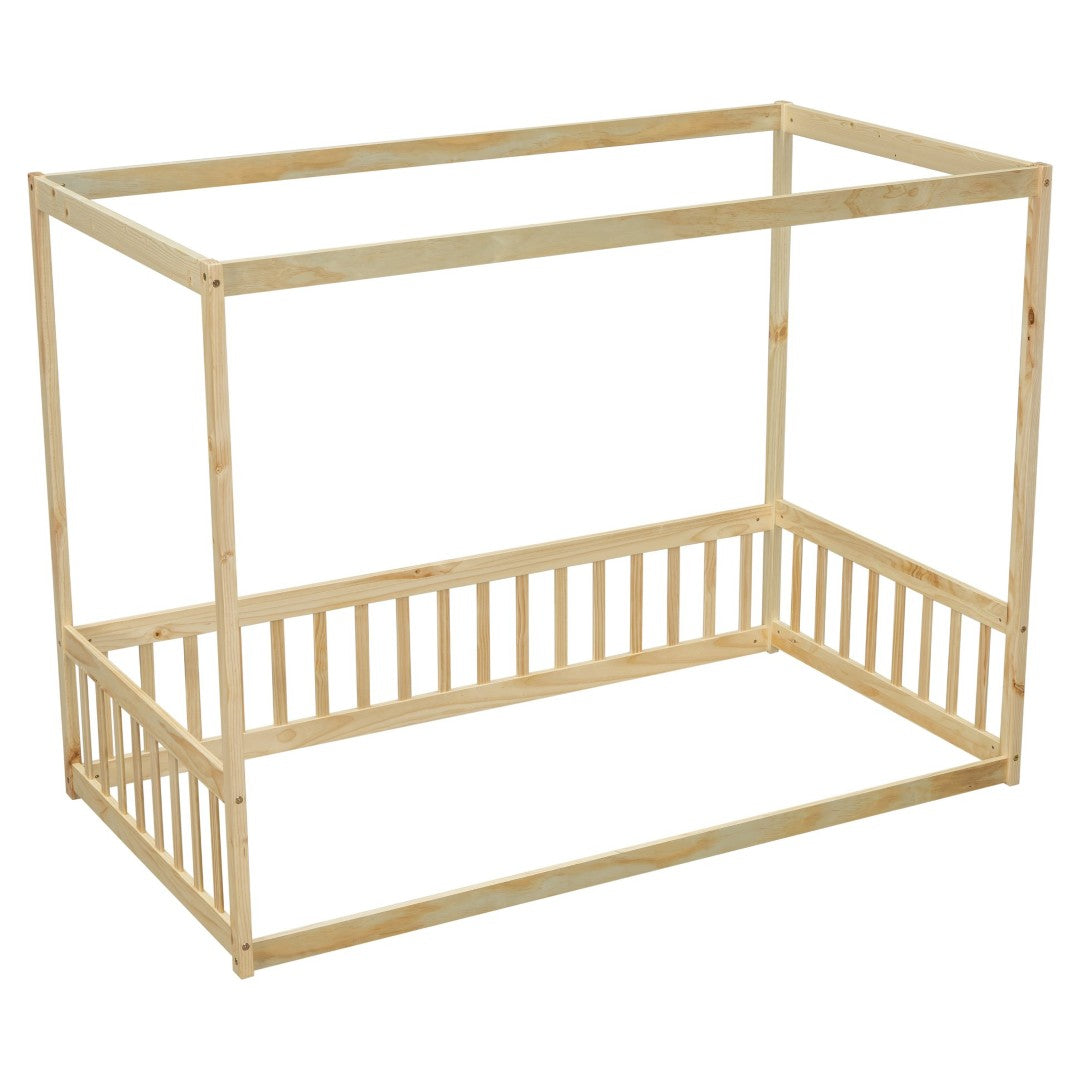 Transform your child's bedroom into a cozy, imaginative retreat with this Twin canopy floor bed. Crafted from natural pine and plywood, its house-style frame and protective fence/guardrails invite play and storytelling while keeping the sleeping area close to the floor for safety and accessibility. The minimalist natural finish blends easily with a variety of decor styles, and the sturdy construction provides dependable support for everyday use.