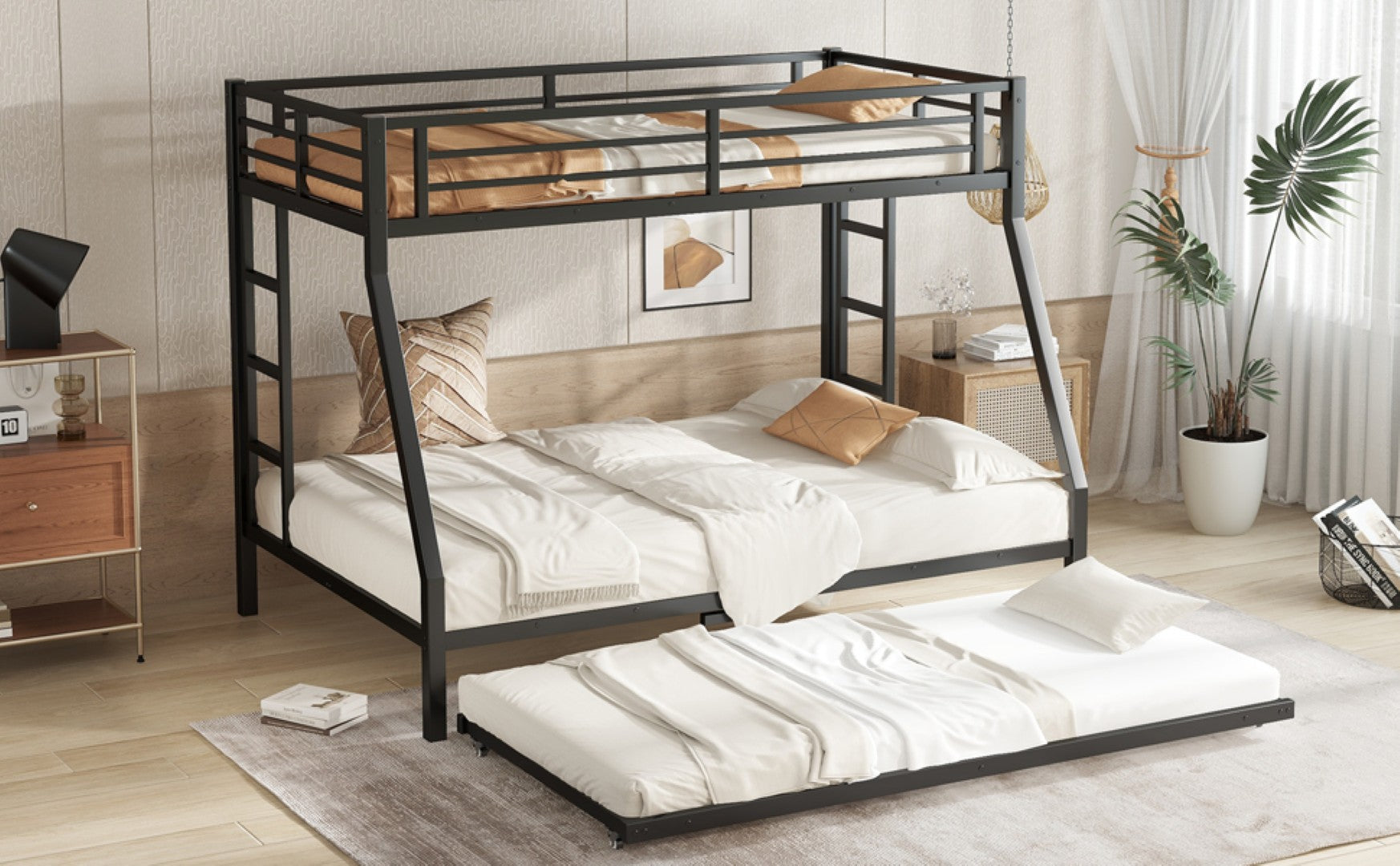 Modern, space-saving, and built to last: this Twin-over-Full metal bunk bed with a Twin trundle is an ideal choice for shared bedrooms, guest rooms, or compact living spaces. Designed for everyday use, it combines a reinforced steel frame with practical safety features and a sleek black finish to deliver a sturdy sleeping solution that maximizes floor space while offering comfortable support for up to three sleepers.