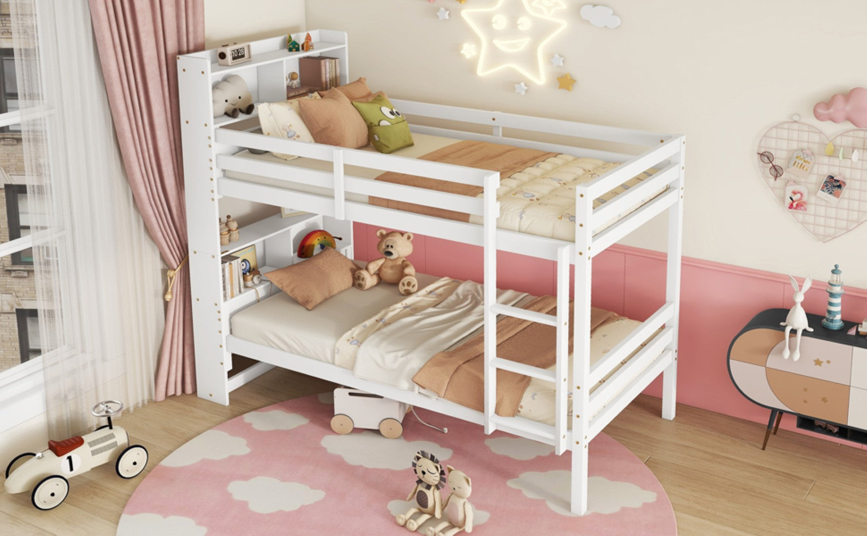 Give your children's room a smart, space-saving centerpiece with this sturdy twin-over-twin bunk bed. Thoughtfully designed with built-in shelving, safety guardrails, and a convertible frame, it blends practical storage and long-term versatility with a clean white finish to suit a variety of décor styles.