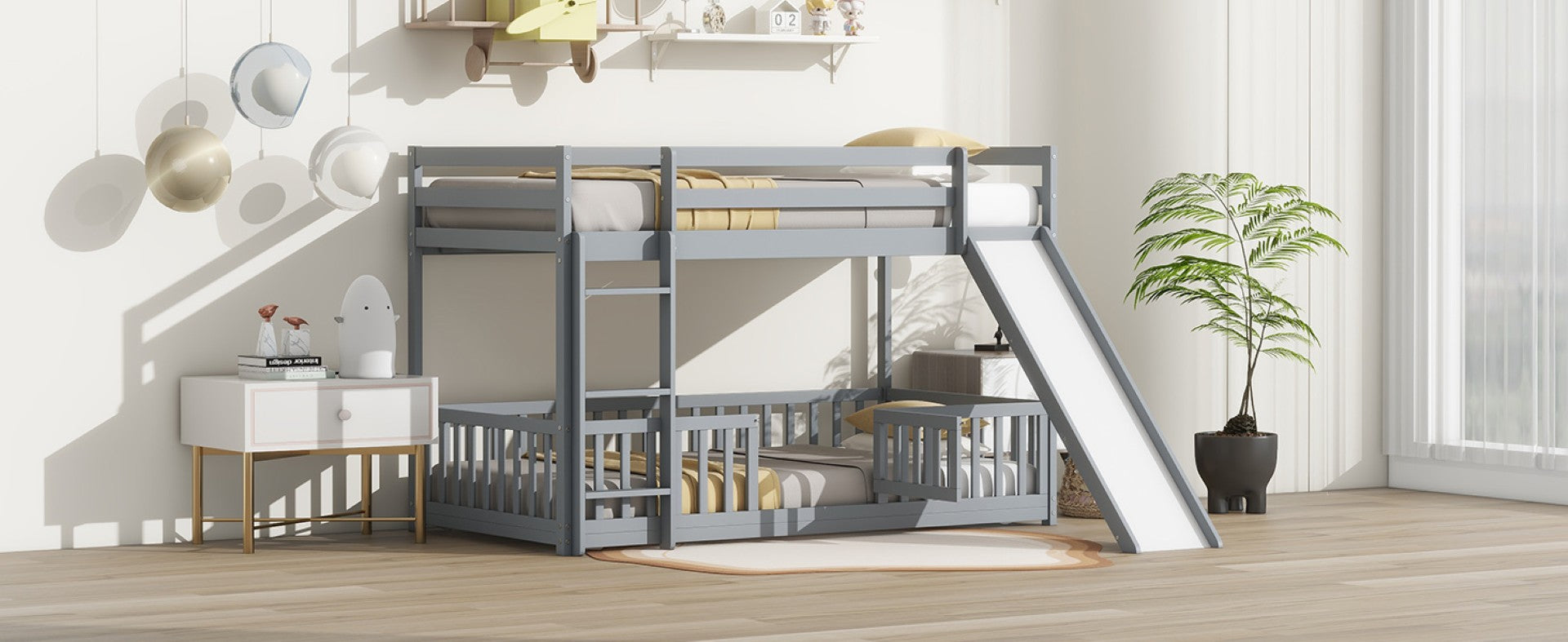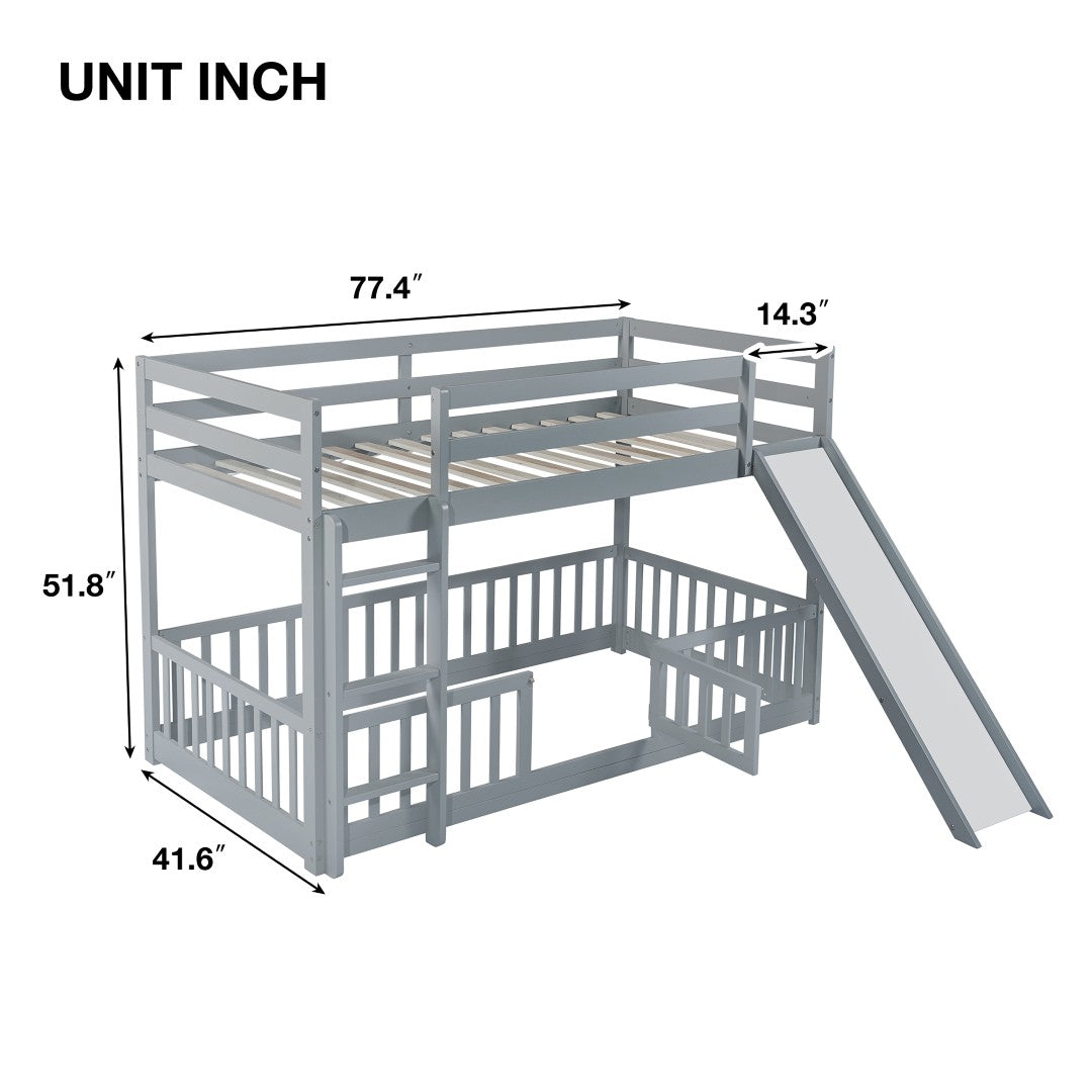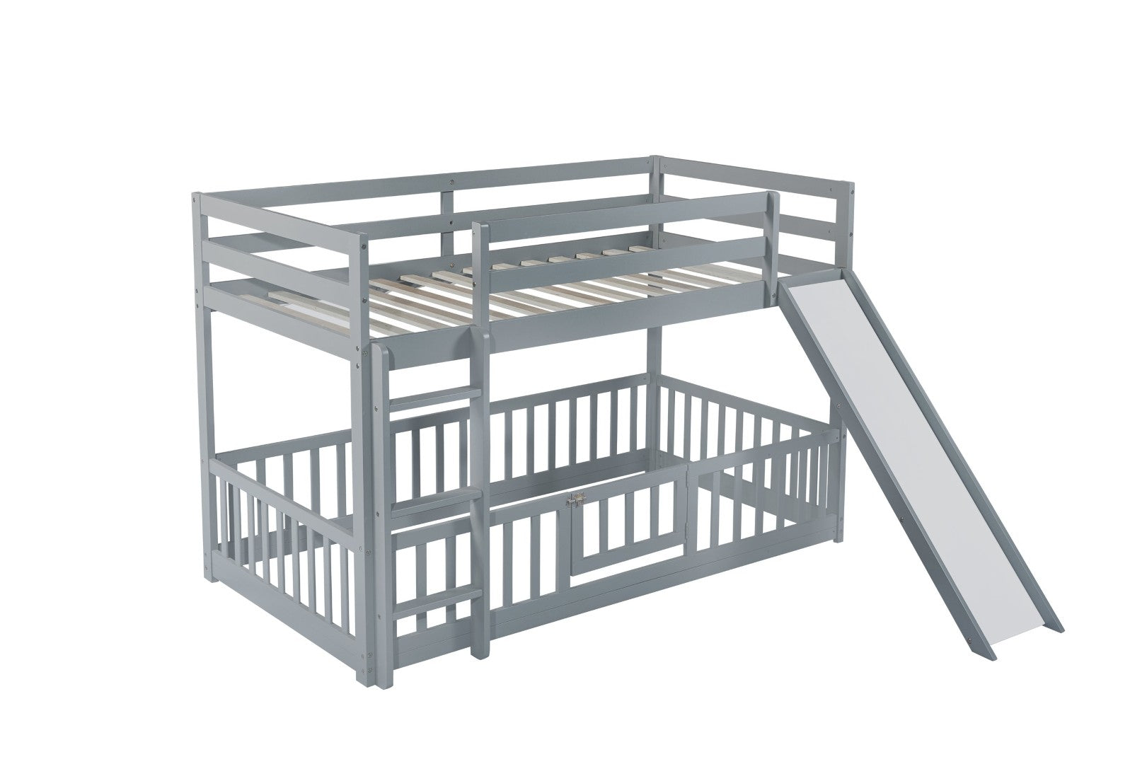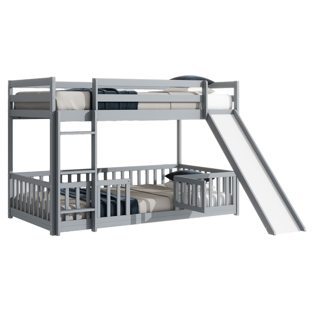 Bring play and practicality into your child's bedroom with this sturdy twin-over-twin floor bunk bed in a charming grey finish. Crafted from solid pine with plywood and PB components, it combines rustic style with everyday durability, featuring an integrated slide, ladder, and safety guardrails for secure, active use. Designed to maximize space while offering a cozy sleep and play solution, this bunk bed is easy to assemble and ideal for siblings, sleepovers, or creative bedroom layouts.