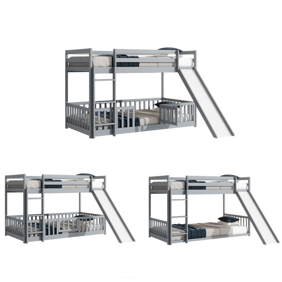 - #4 [Convertible Ladder and Slide, Assembled in 3 Distinct Styles] Equipped with the built-in ladder, accessing the top bunk becomes effortless for climbing up and down. This bunk bed includes a low slide designed for playful enjoyment, enhancing a fun. The slide and ladder are convertible, allowing for flexible placement on either the left or right side. Furthermore, the bed is designed to be assembled in three distinct configurations as per your preference for varying scenarios.