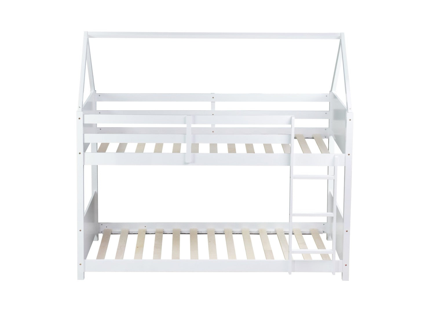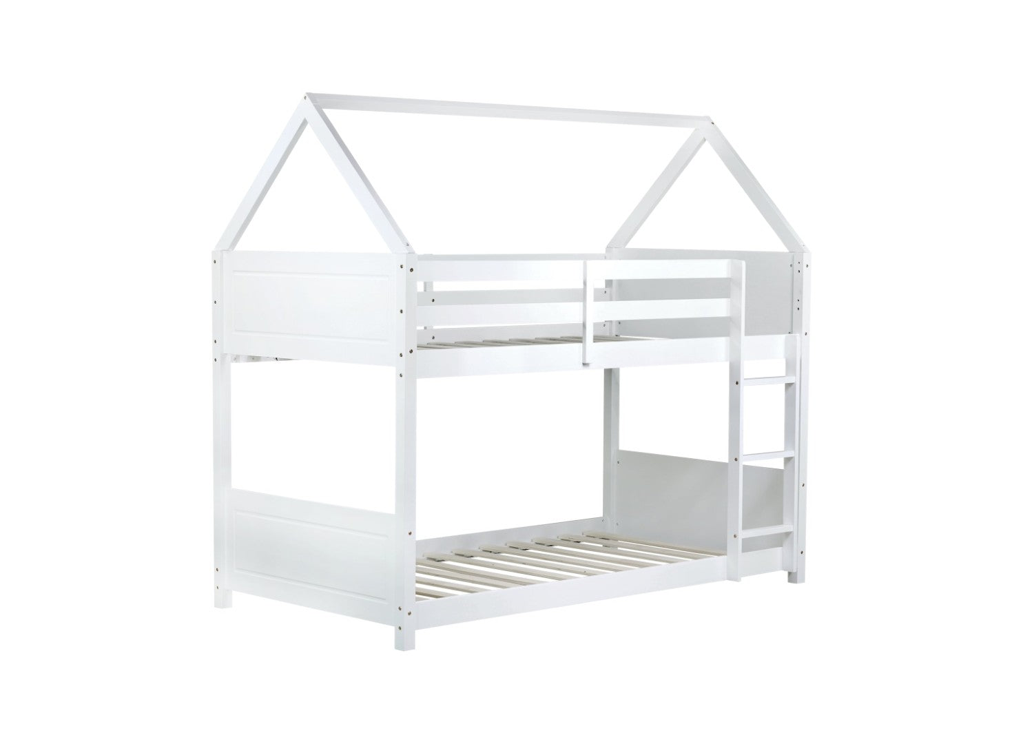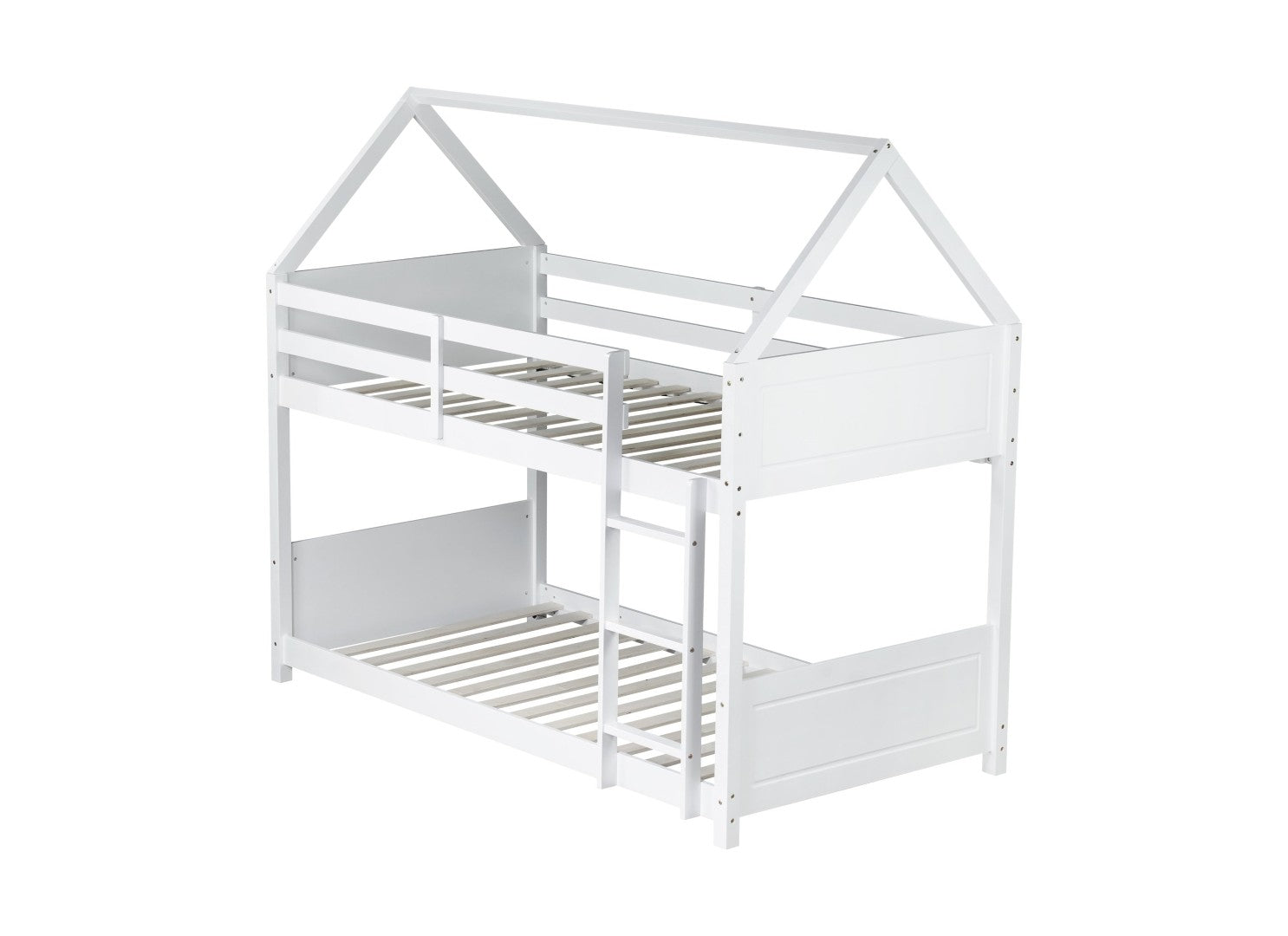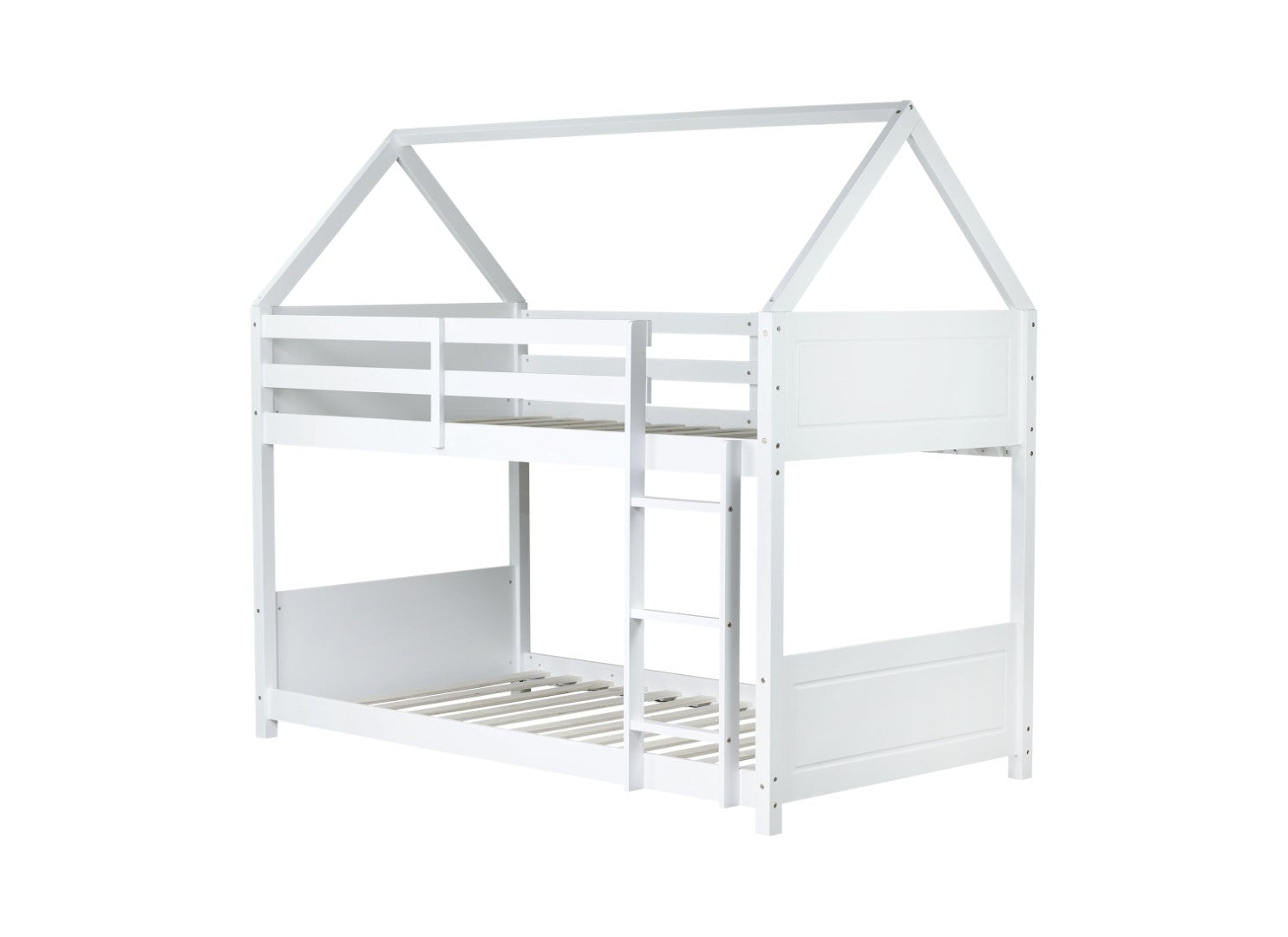 Bring playful charm and dependable function to a child's bedroom with this twin-over-twin house-style floor bunk bed. Designed for everyday use, it offers a cozy top bunk with full-length guardrails and a comfortable lower floor bed that doubles as a sleeping area or a daytime play space. Constructed from rubberwood, plywood and MDF, the bed balances sturdy support with a clean white finish that complements a variety of decor styles. Clear assembly instructions and included hardware make setup straightforward.