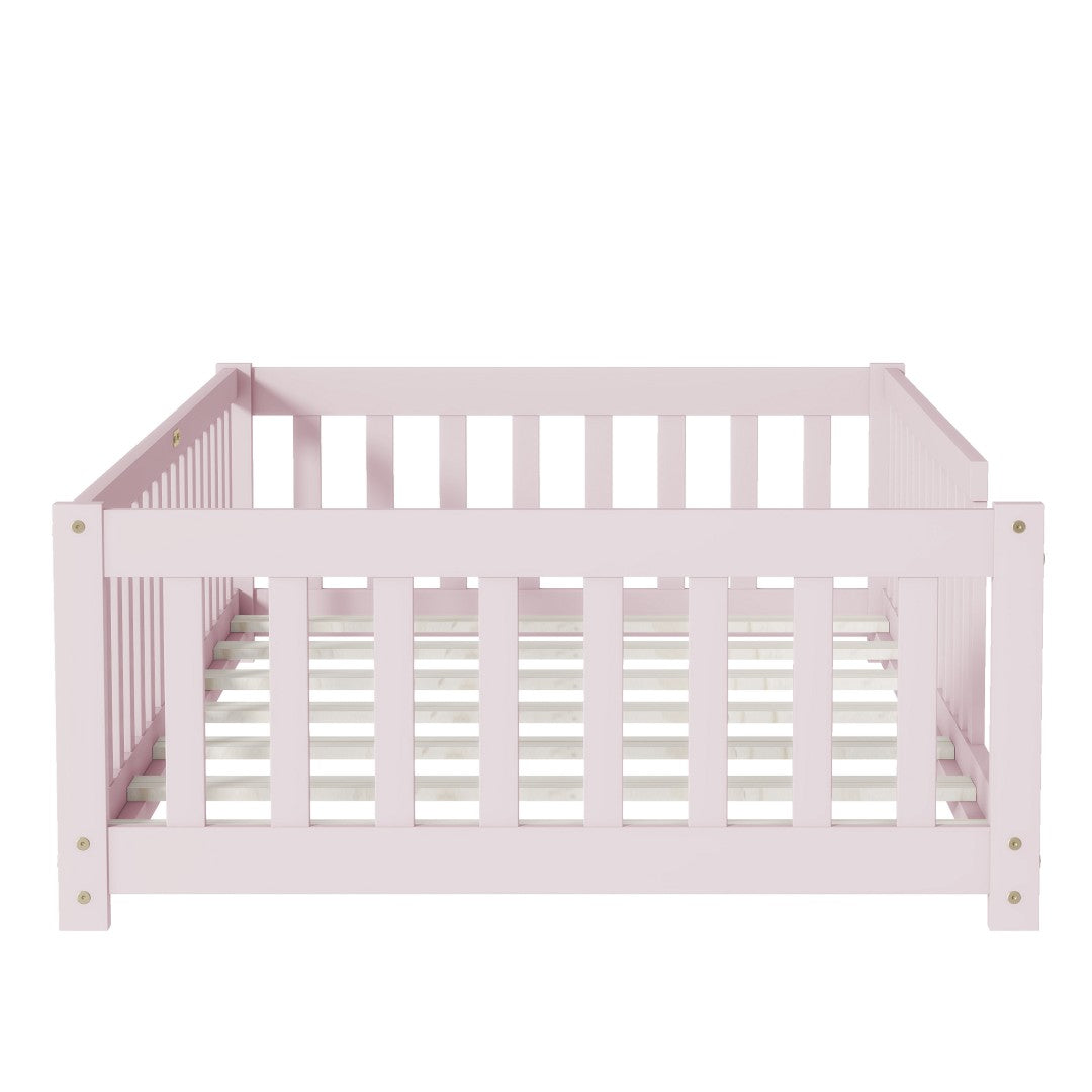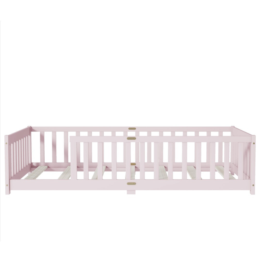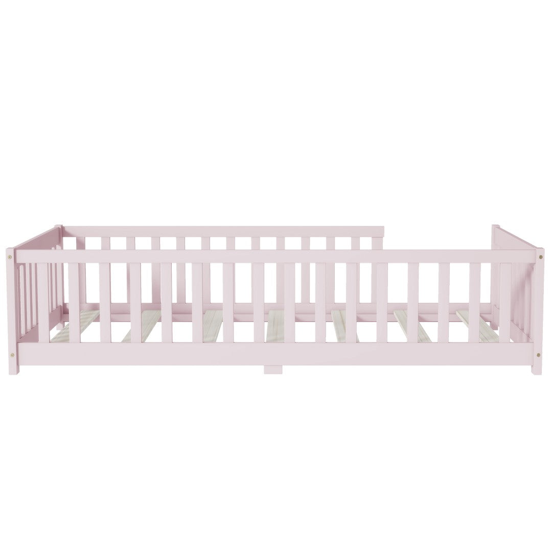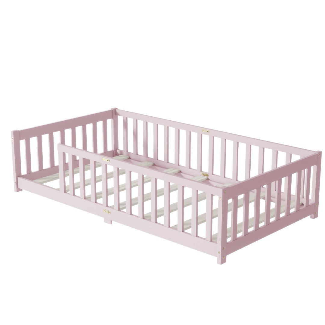Create a cozy, low-profile sleeping space with this twin-size floor bed featuring a protective fence and safety guardrails. Constructed from durable rubberwood with eco-friendly paint, this bed blends child-safe materials and sturdy workmanship for everyday use. Its minimalist design sits close to the floor for safer, easier access while keeping a neat, modern look in any pink-themed bedroom.