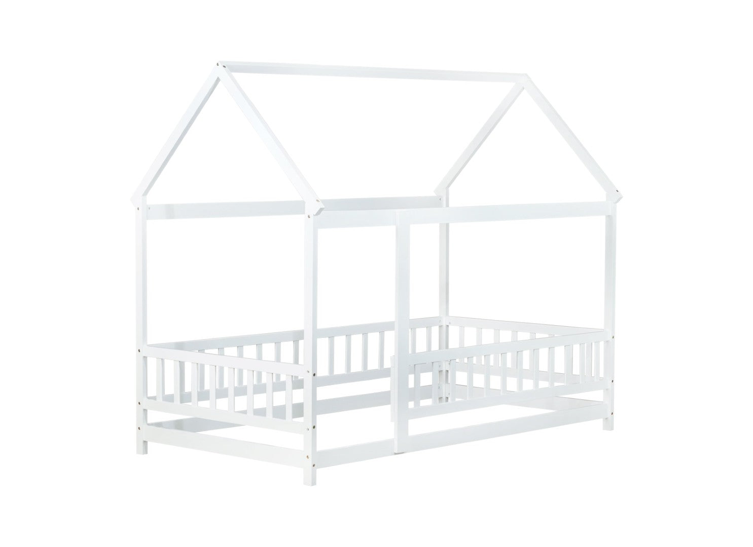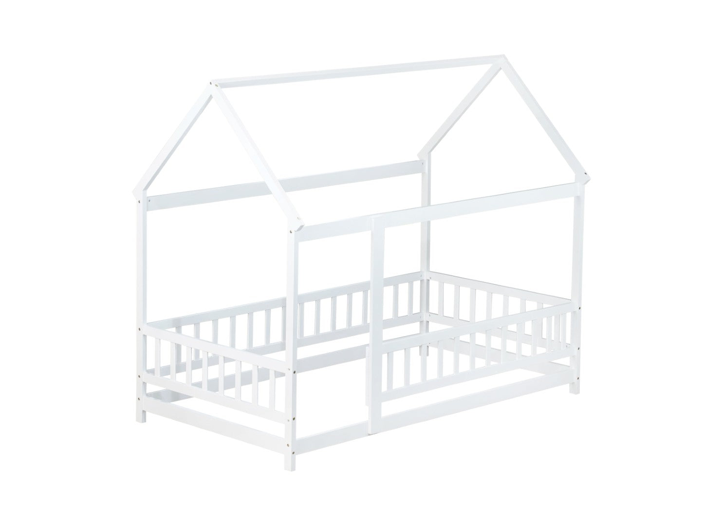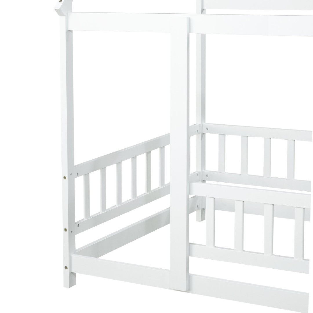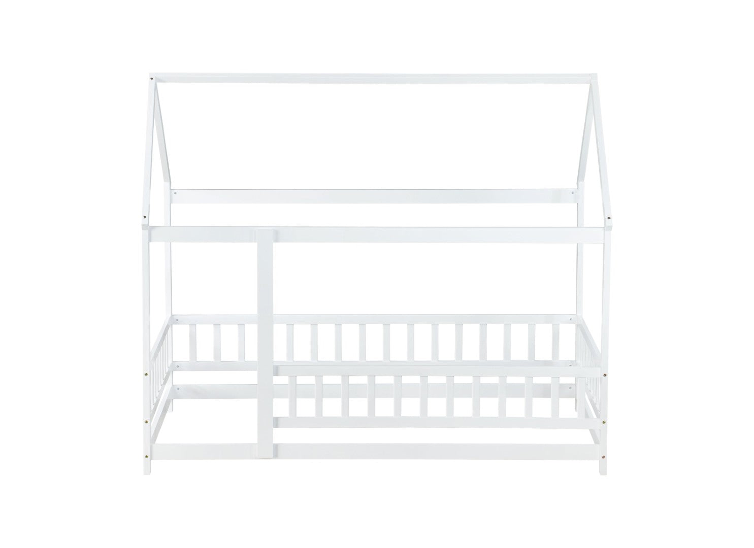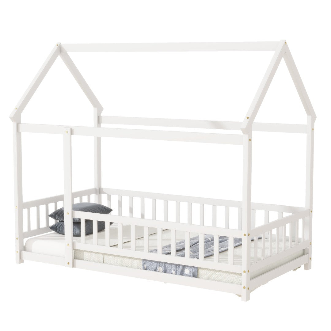 Transform your child's bedroom into a cozy, imaginative hideaway with this twin-size wooden floor bed featuring a charming house-shaped roof frame and safety guardrails. Designed to spark creativity while providing a secure sleeping area, the bed blends sturdy rubberwood construction with clean white finishes for a timeless look that complements many decor styles. Easy to assemble with included hardware and manual, it’s ideal for kids who love playtime and rest in the same space.