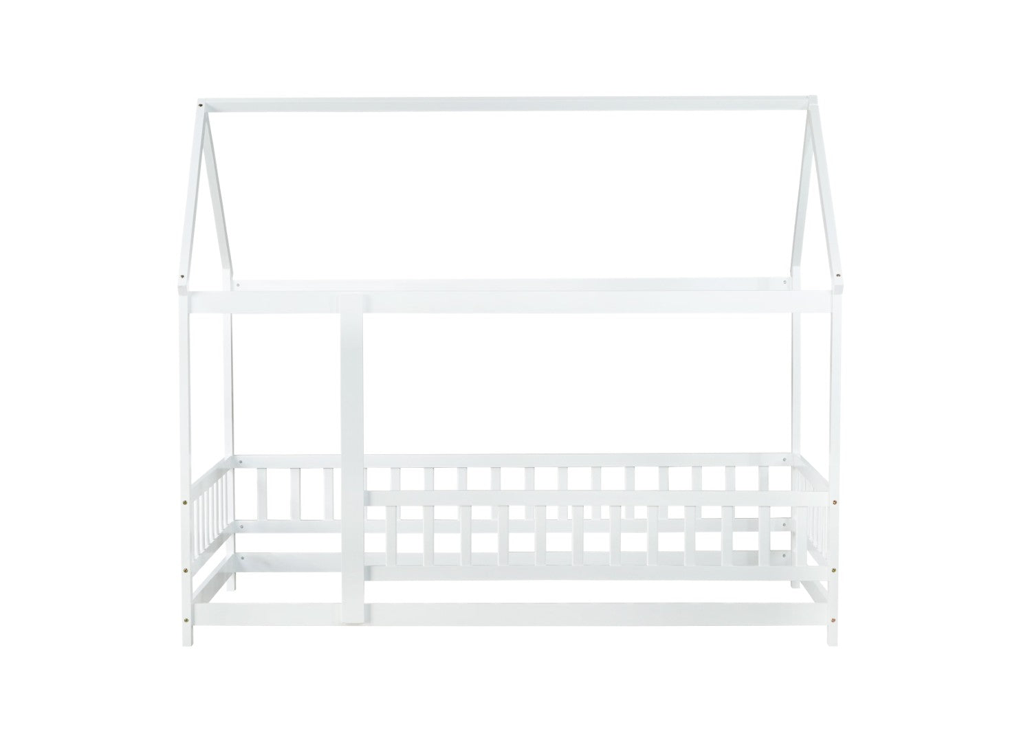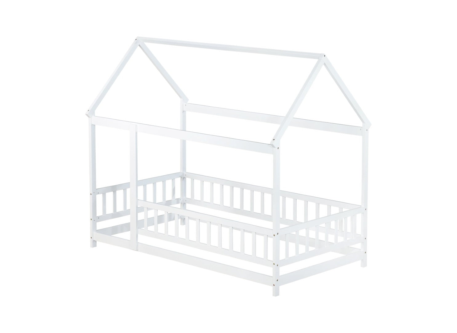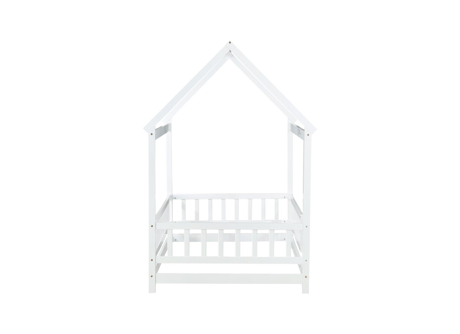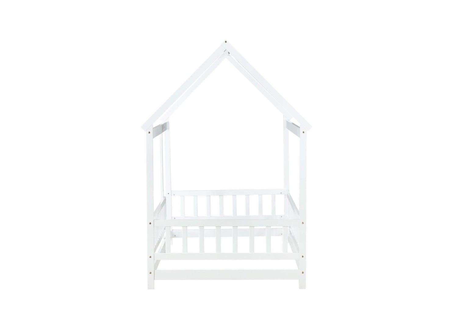 Transform your child's bedroom into a cozy, imaginative hideaway with this twin-size wooden floor bed featuring a charming house-shaped roof frame and safety guardrails. Designed to spark creativity while providing a secure sleeping area, the bed blends sturdy rubberwood construction with clean white finishes for a timeless look that complements many decor styles. Easy to assemble with included hardware and manual, it’s ideal for kids who love playtime and rest in the same space.