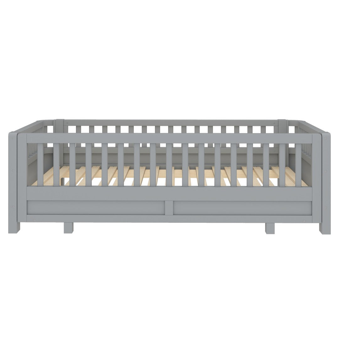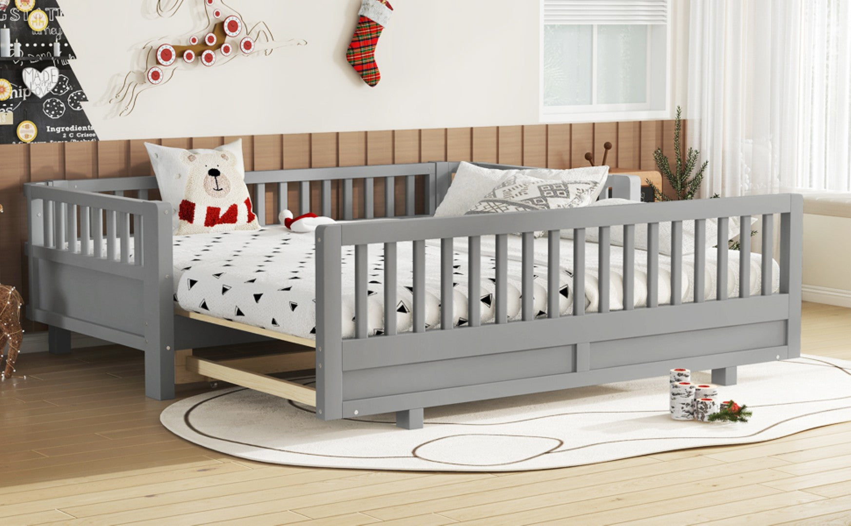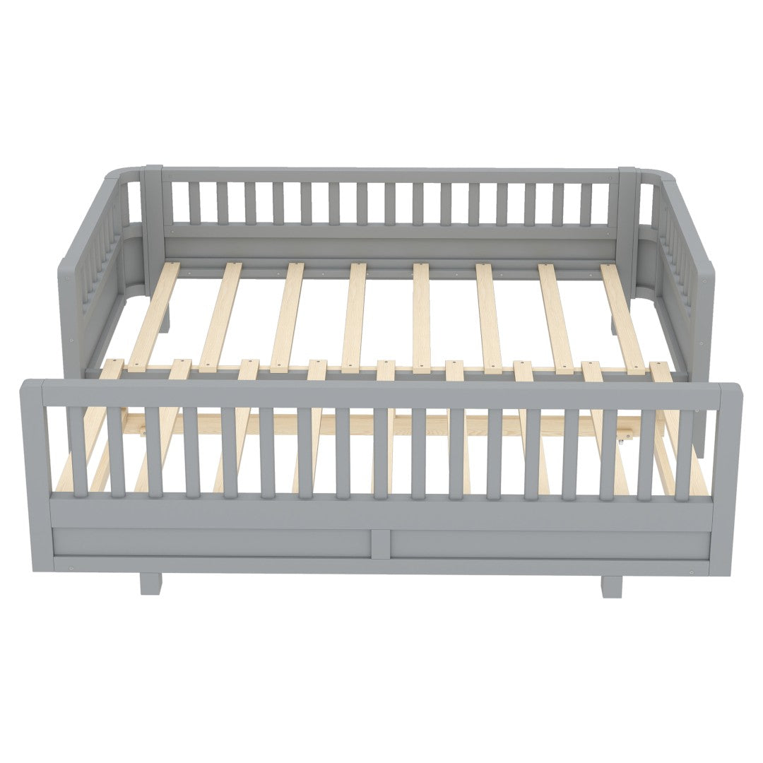 Experience versatile, safe, and stylish sleeping solutions with this convertible solid wood twin platform bed. Thoughtfully engineered for growing families and flexible living spaces, the bed easily converts from a single twin to a double twin configuration by adjusting the movable side guardrail. Its solid pine construction, full-length guardrails, and rounded corners deliver durability and peace of mind, while the minimalist grey finish complements modern or classic décor. Assembly is straightforward with included tools and an illustrated guide—ideal for bedrooms, guest rooms, or compact apartments.