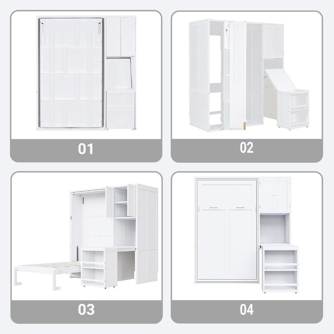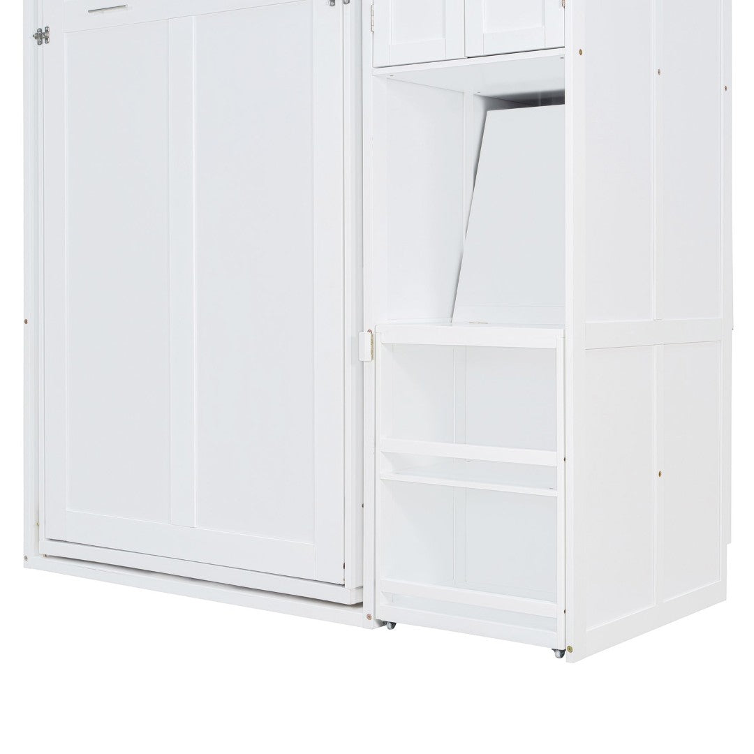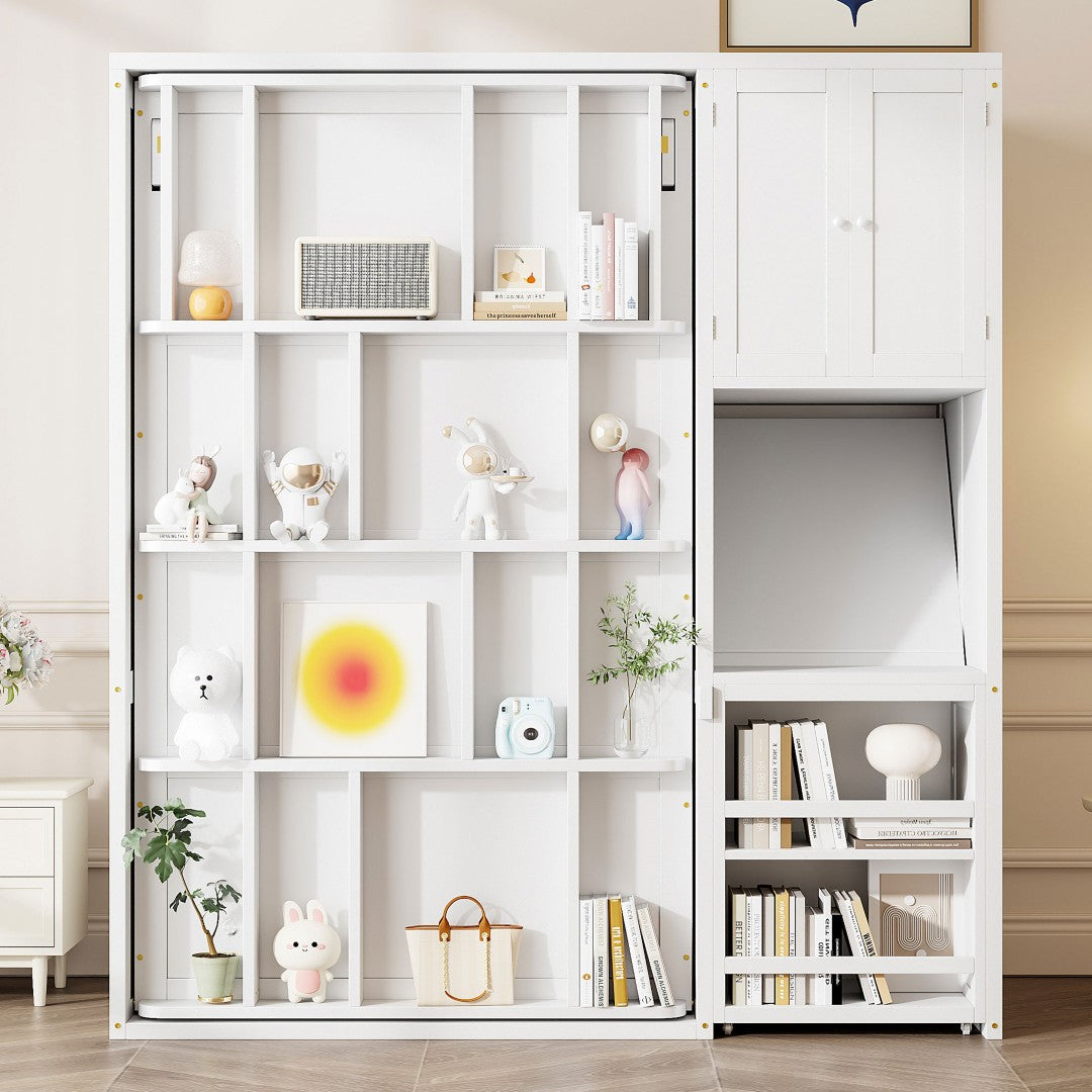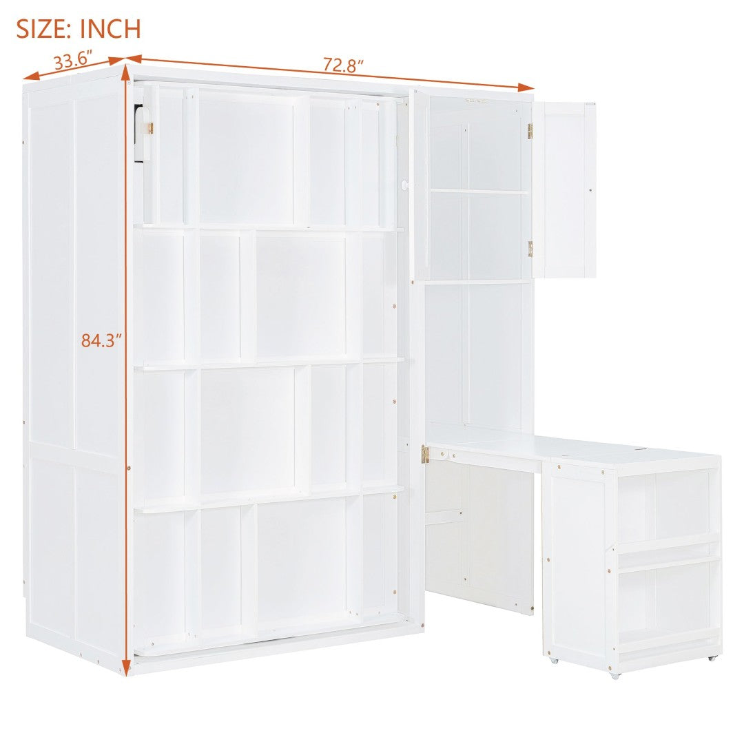 Bring multifunctional design and smart storage to compact spaces with this rotating Murphy bed. Perfect for studios, guest rooms, dorms, or home offices, the unit folds and rotates to reveal a bookshelf front, hides belongings in a top cabinet, and converts into a comfortable twin sleeping surface—while an extendable desk and side shelving provide a dedicated workspace and display area.