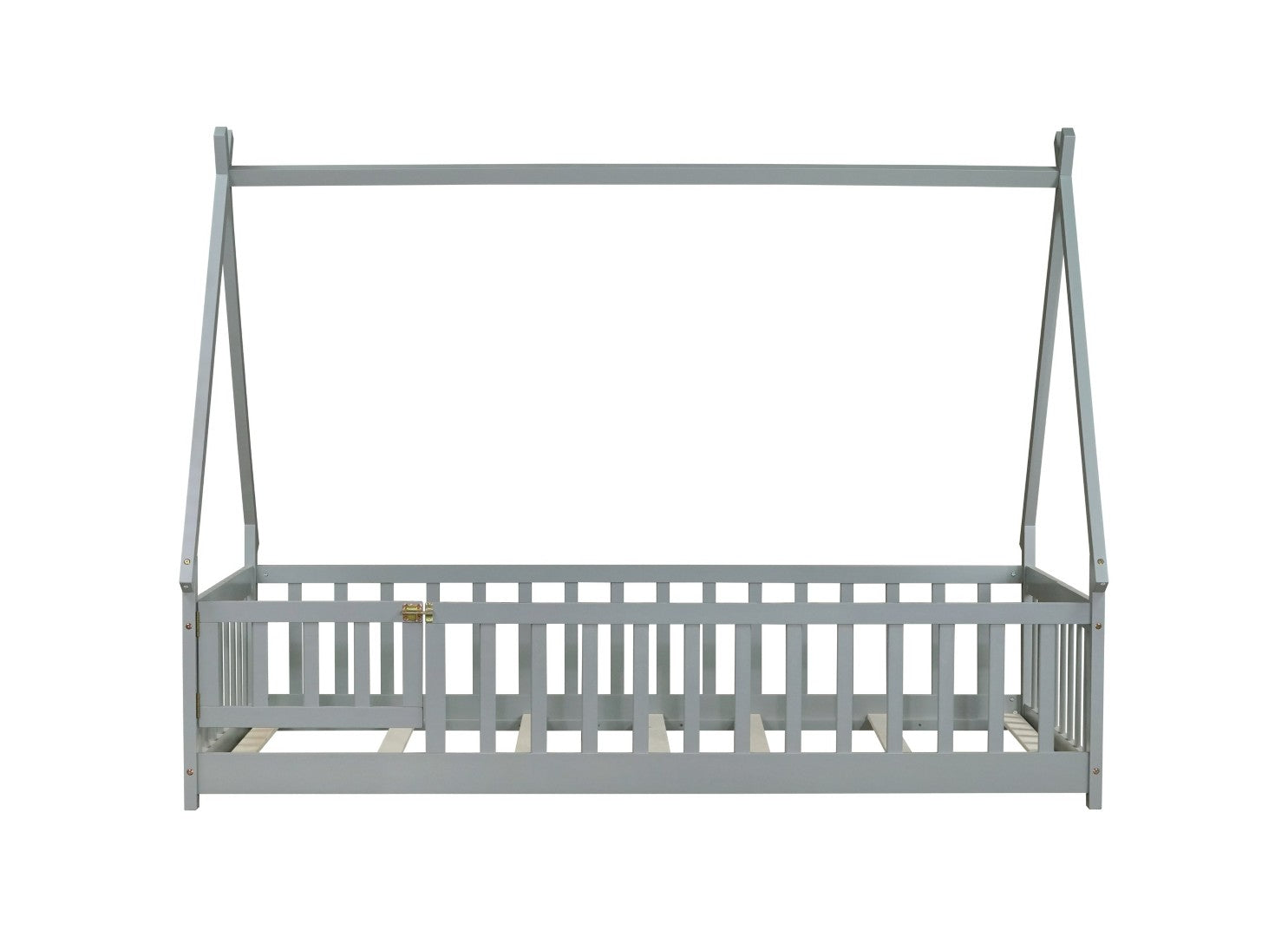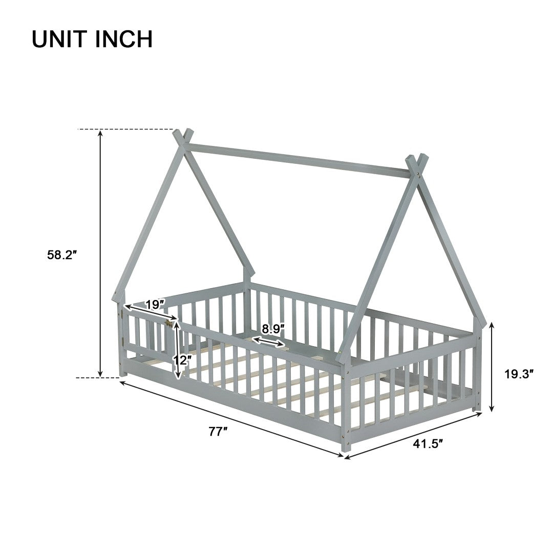 Bring playful, cozy design into a child’s bedroom with this Twin tent-shaped floor bed. Combining the charm of a teepee frame with practical guardrails and sturdy slats, it creates a snug, nature-inspired sleep space that feels like a private hideaway while maintaining a clean, minimalist look. Built from durable materials and designed for low-profile placement, it’s ideal for toddlers transitioning from a crib or for kids who love imaginative, themed rooms.