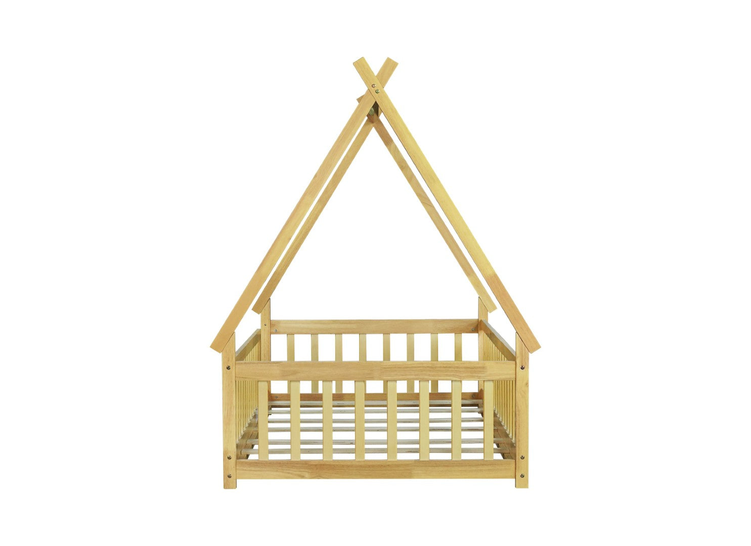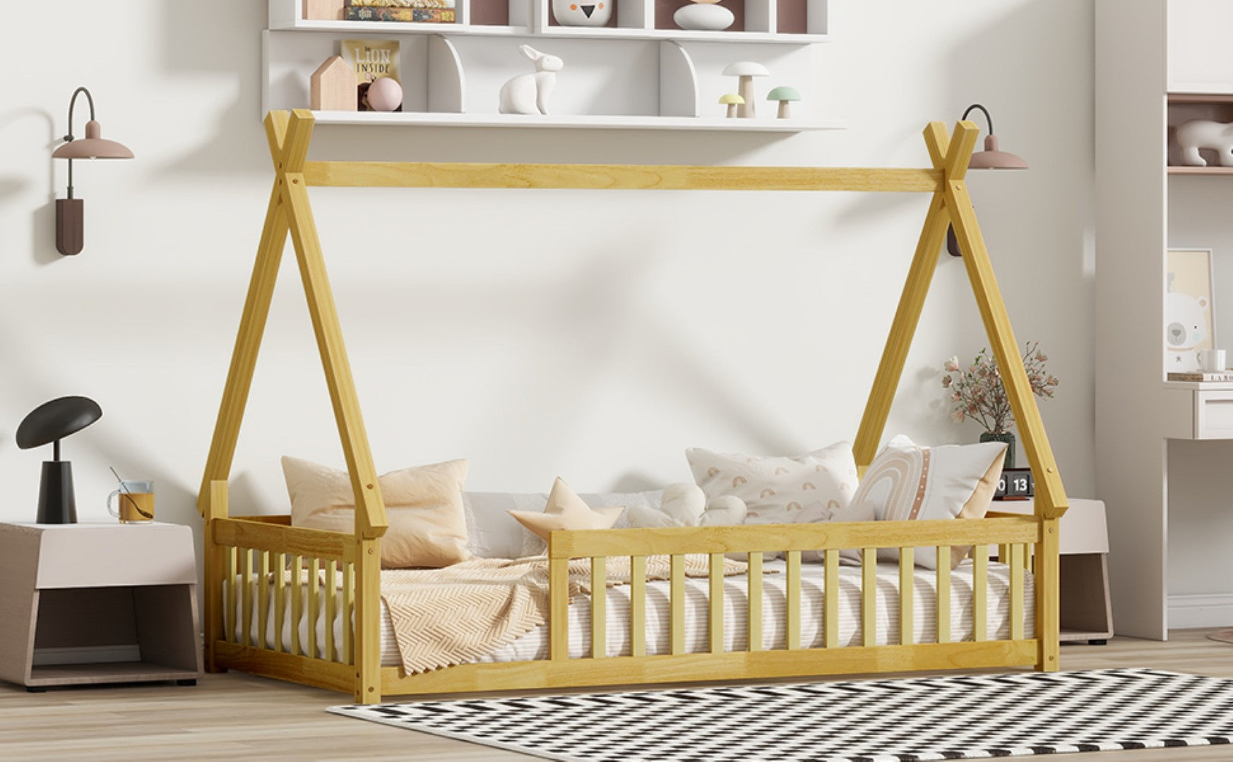 Bring a playful, nature-inspired focal point to your child's room with this twin tent-shaped floor bed. Designed to evoke the cozy charm of a teepee while offering practical safety and support, it blends minimalist architecture with warm natural materials. The low-profile frame encourages independent sleep for toddlers and children, while the integrated guardrails and open canopy create a snug, imaginative space for rest and play.