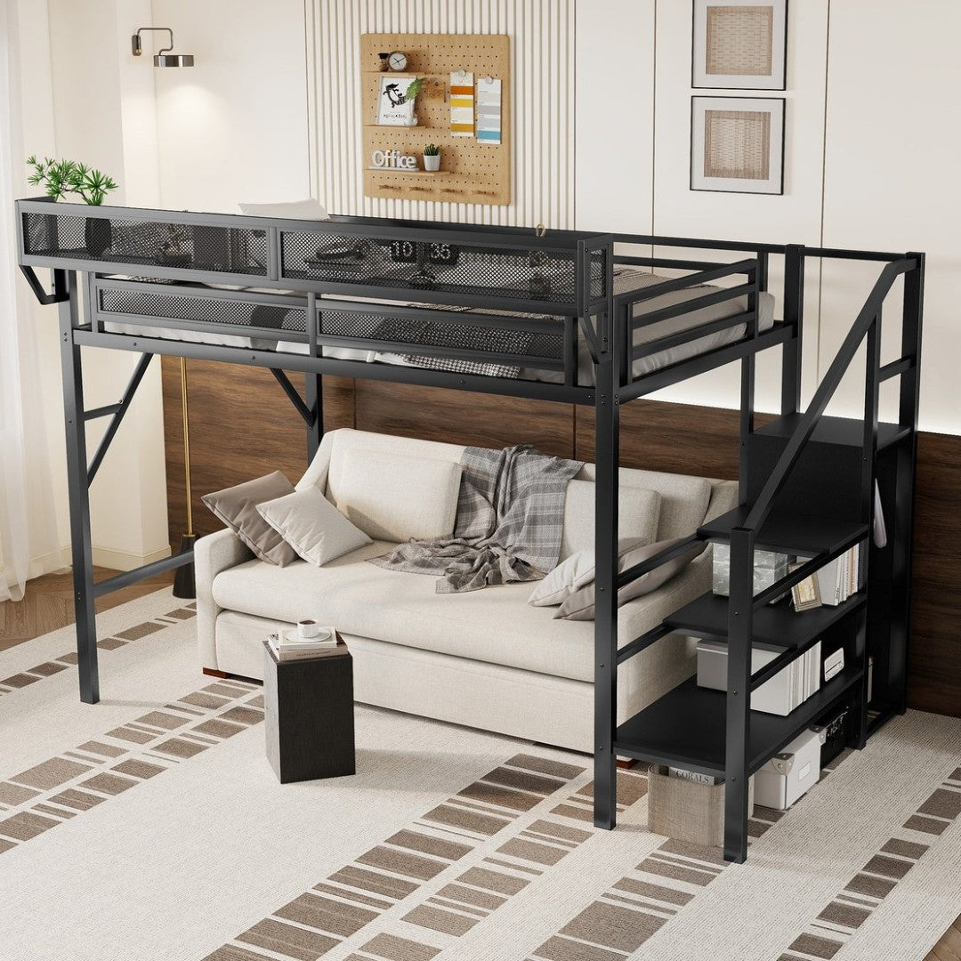 Give your teen or guest a smart, space-saving sleeping solution with this Twin XL loft bed. Built from sturdy metal and finished in sleek black, it combines a high sleeping platform with integrated storage and a safe staircase—perfect for small rooms, dorms, or shared spaces where organization and durability matter.