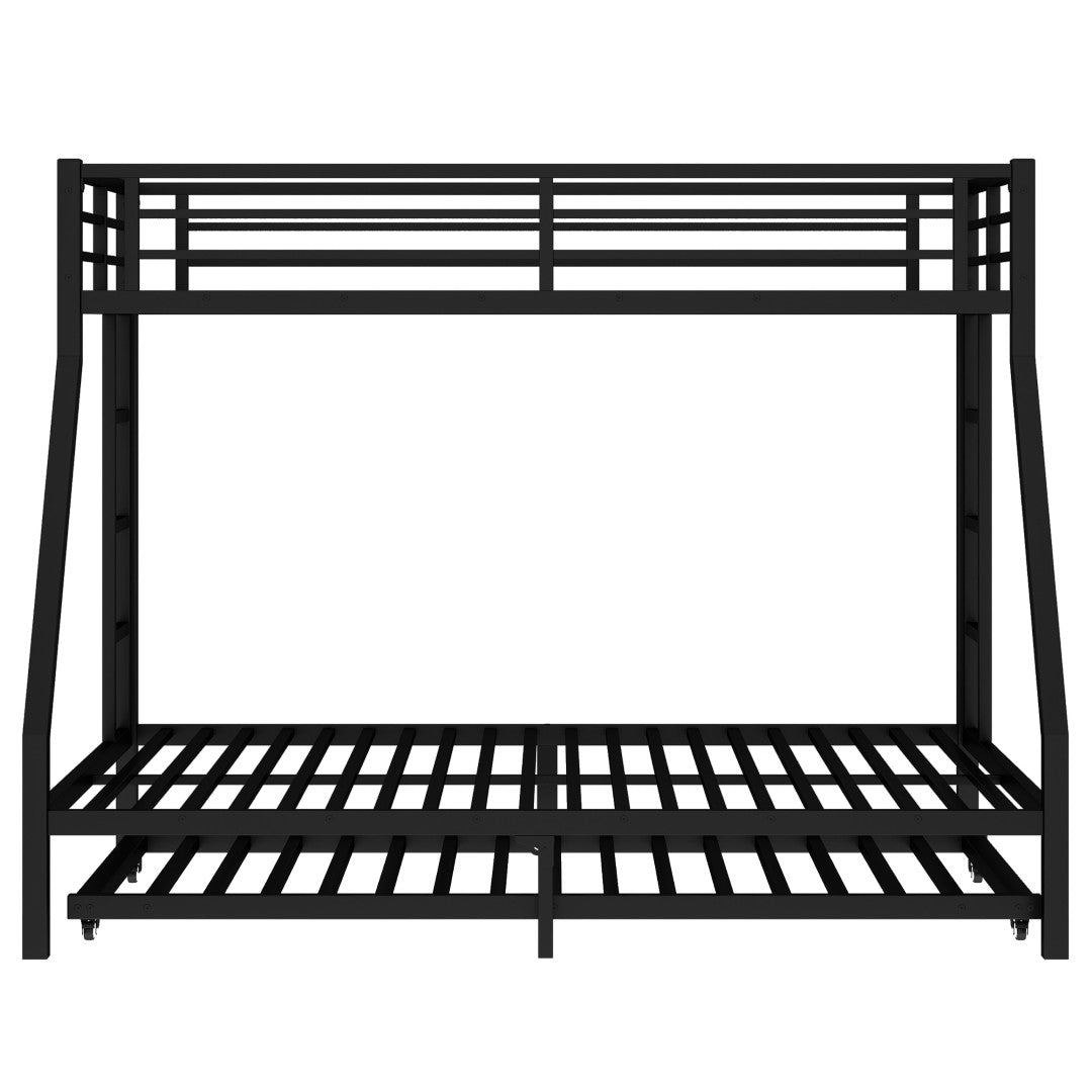 This sturdy Twin XL over Queen metal bunk bed with a twin-size trundle combines space-saving design and heavy-duty construction to accommodate families, shared bedrooms, guest rooms, or short-term rentals. Built from thicker steel tubing and reinforced joints, it delivers a stable, wobble-resistant sleep solution with a low-profile, modern black finish that fits a variety of décor styles. The included trundle provides an extra sleeping surface that tucks away when not in use.