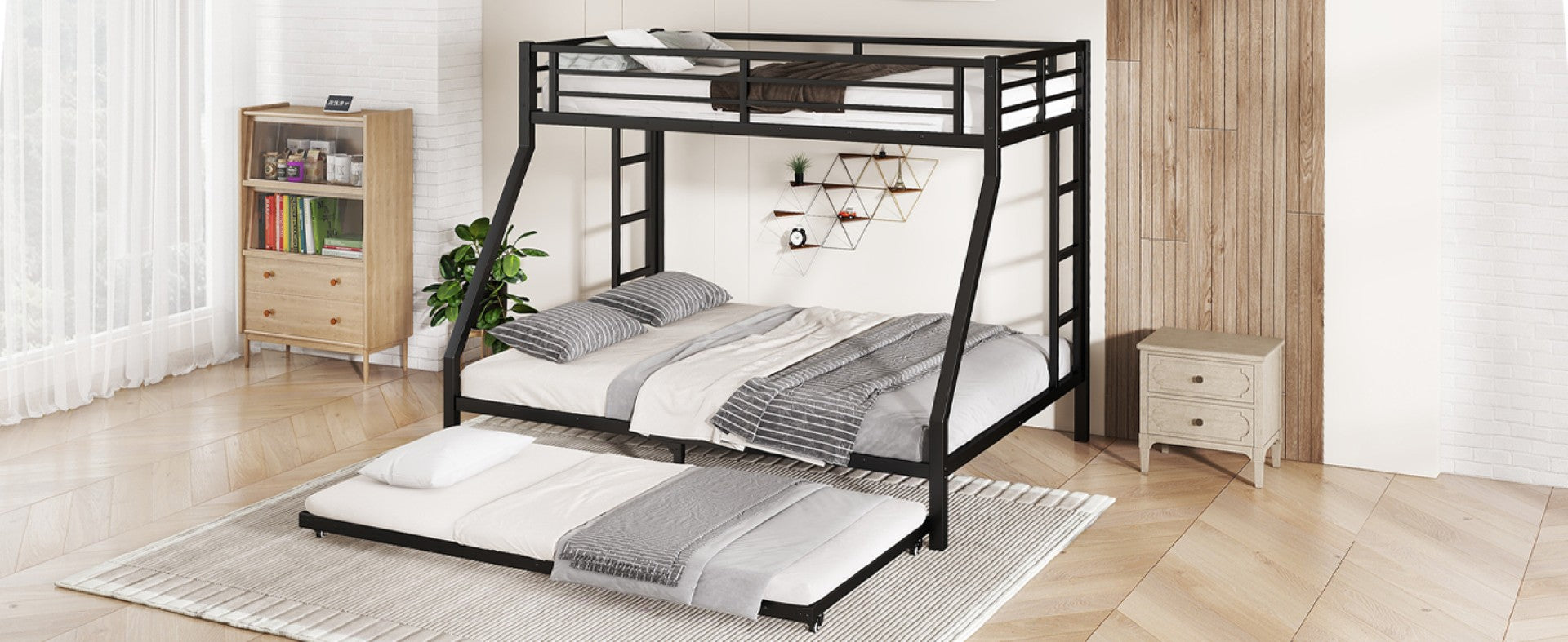 - Bed configuration: Twin XL upper bunk over Queen lower bunk with a pull-out twin-size trundle.
