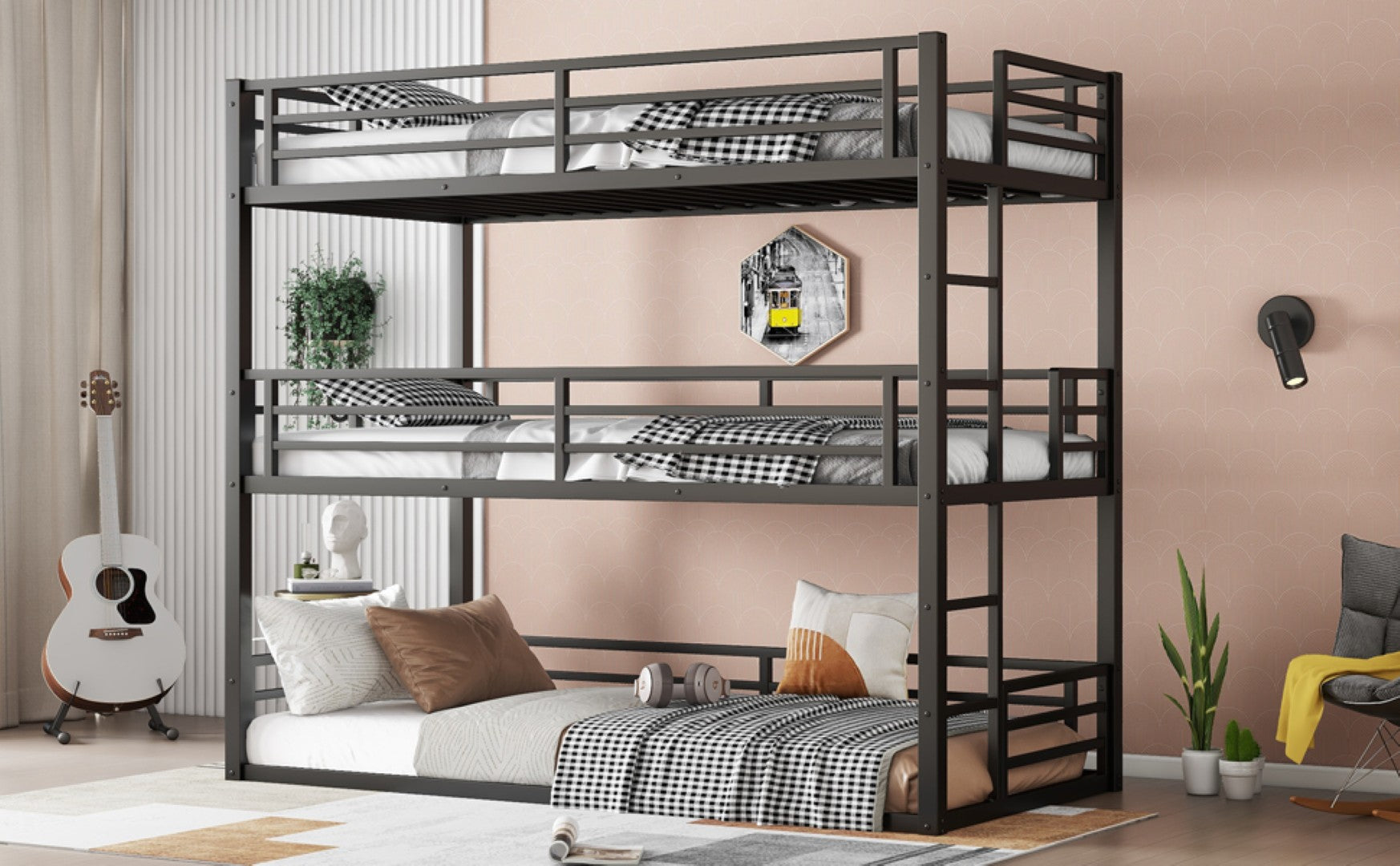 Maximize sleeping space without sacrificing style or safety with this sturdy metal triple bunk bed. Designed for dorms, hostels, guest rooms, or shared bedrooms, its streamlined black finish and reinforced construction deliver long-lasting support while a noise-reduced design ensures quieter nights for all three occupants.