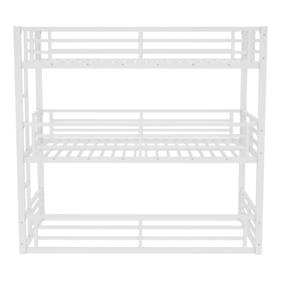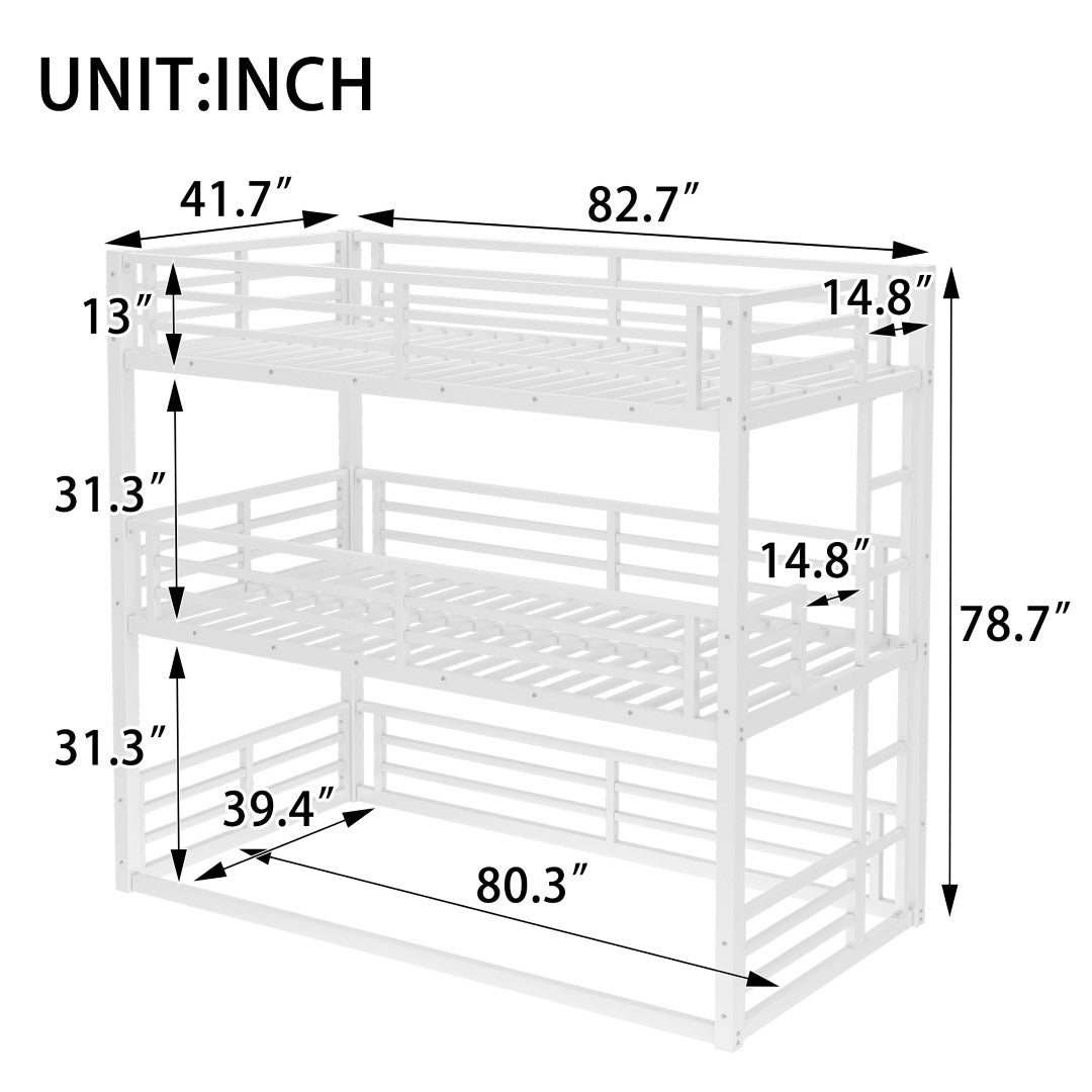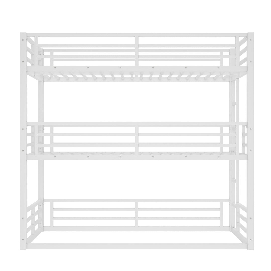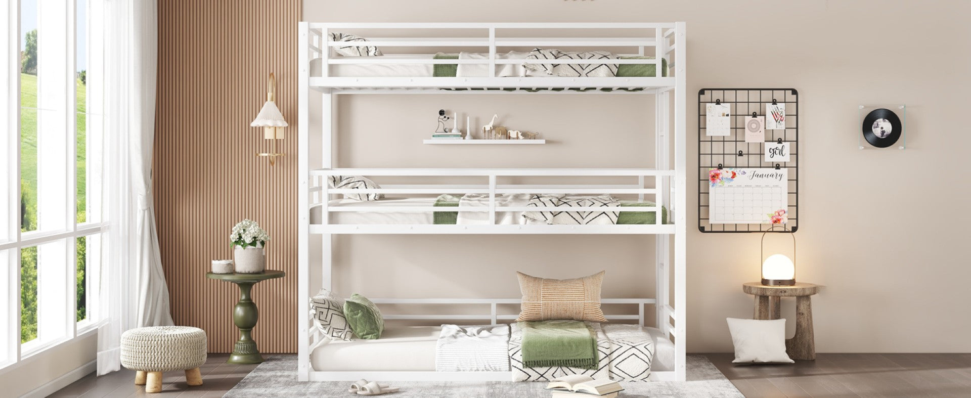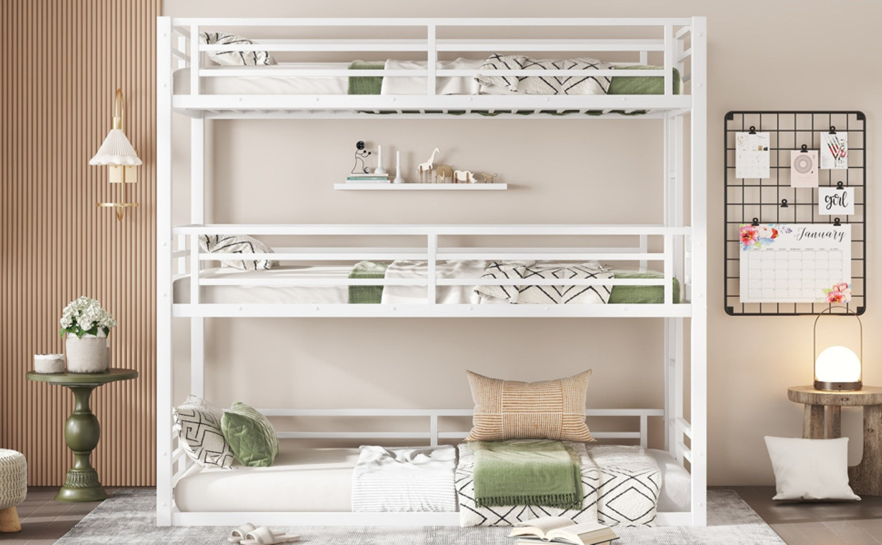 A sturdy, space-saving solution for dorms, shared bedrooms, or guest rooms, this triple twin XL metal bunk bed combines industrial durability with thoughtful safety and comfort features. Its clean white finish and noise-reduced design create a practical, low-maintenance sleeping system that fits narrow rooms while providing three full-length Twin XL sleeping surfaces.
