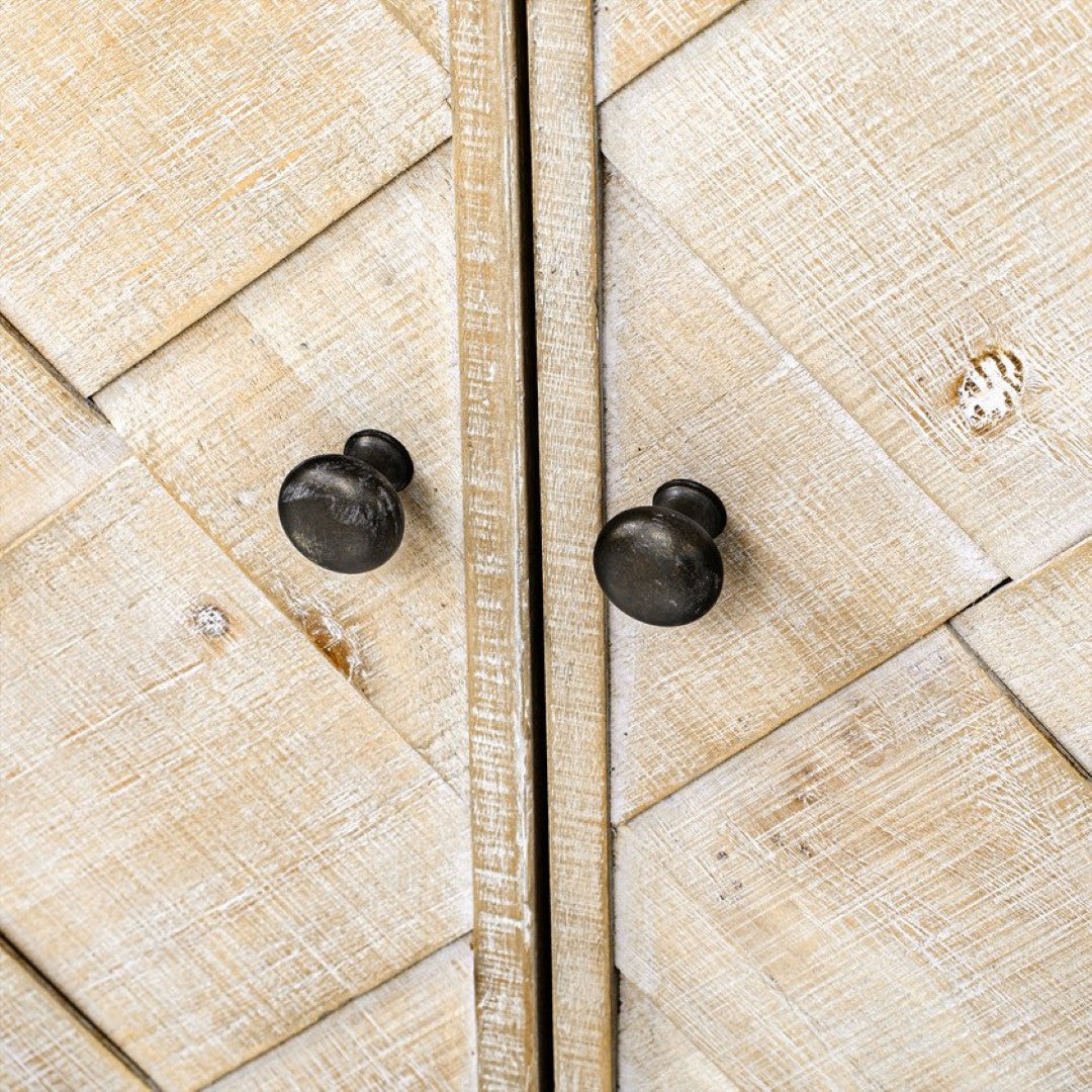 - Materials: MDF construction with premium solid wood veneer on top, doors, and legs for a warm, natural look