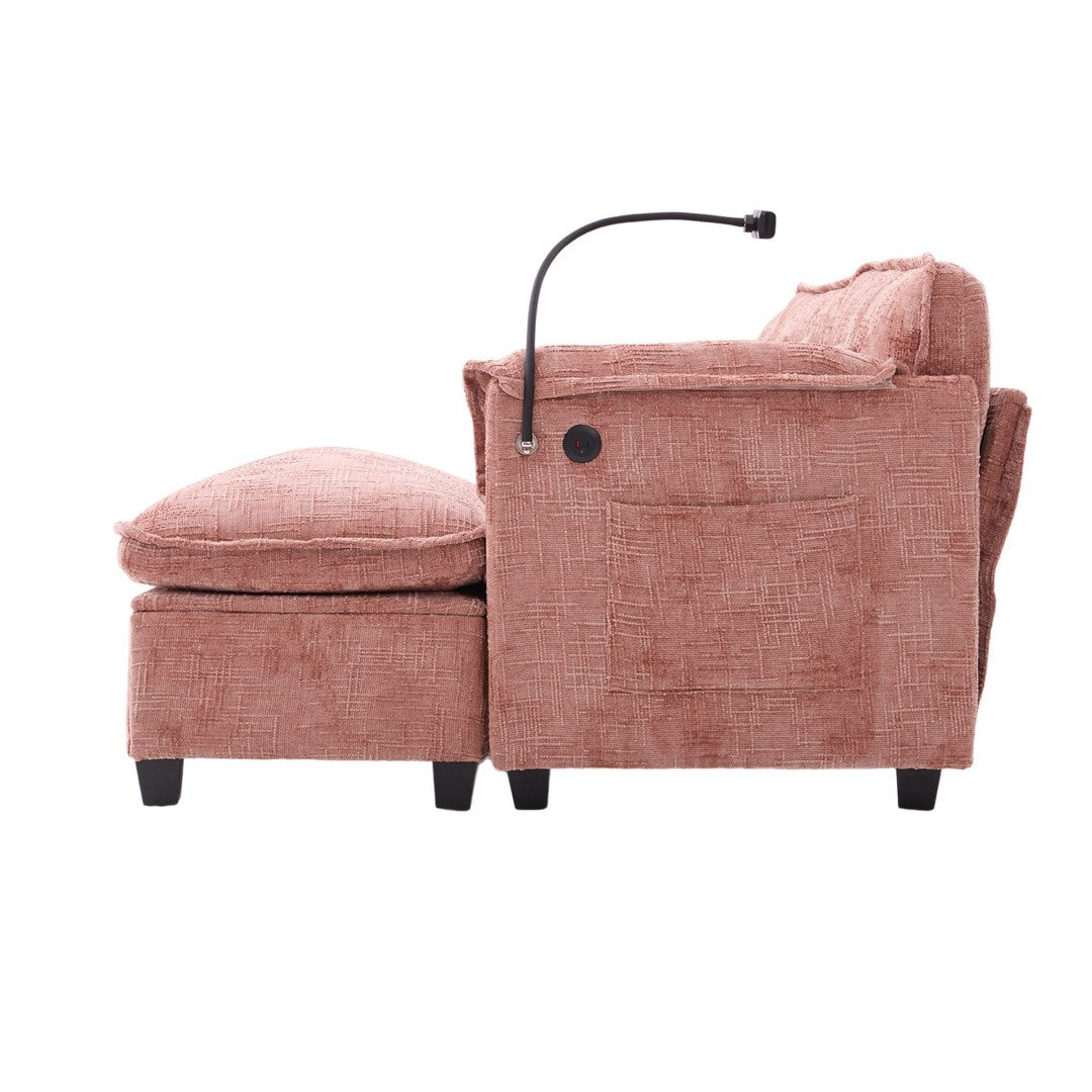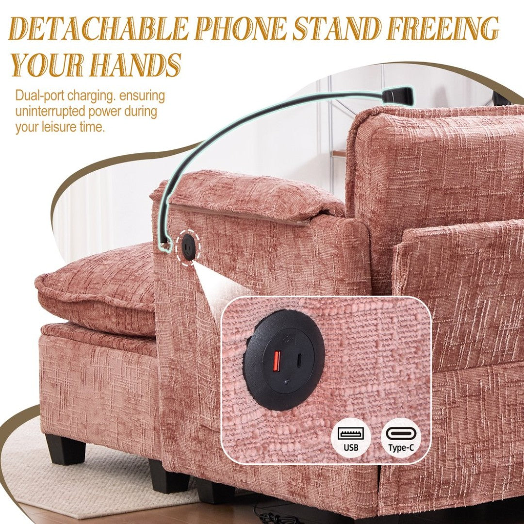 - Charging Ports and Phone Holder:The sofa is thoughtfully equipped with built-in charging interfaces: 1 USB port (5V-2.4A) + 1 Type-C port (5V-2.4A), and a phone holder. This design enables convenient charging of devices while keeping your phone within easy reach, perfectly integrating functionality with modern convenience to deliver a smarter living experience.