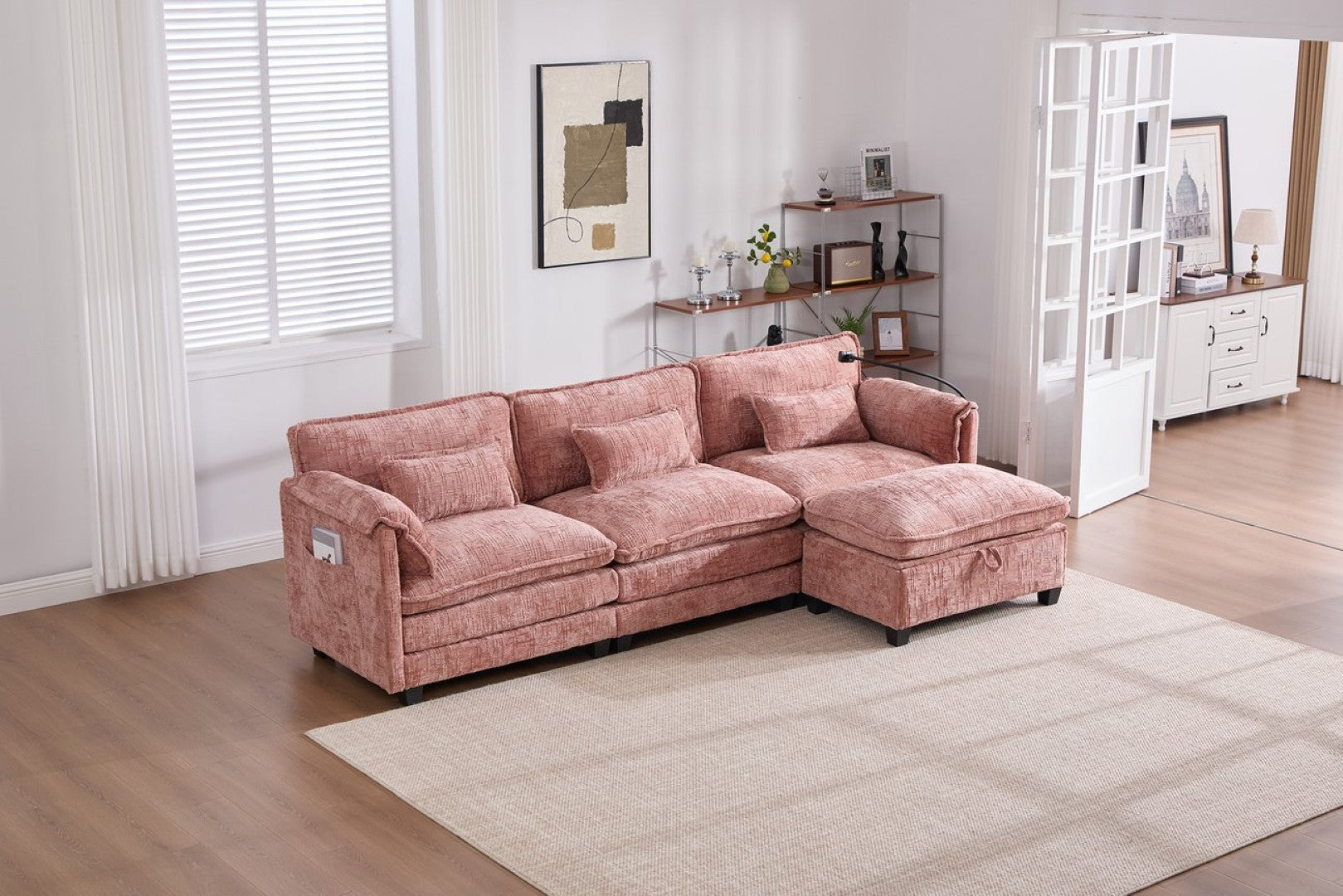 Enjoy movie nights, family gatherings, or solo relaxation with this oversized modular sectional designed for comfort, durability, and everyday convenience. Upholstered in soft, wear-resistant chenille, the sofa combines high-resilience foams, springs, and a solid wood frame to deliver long-lasting support. Thoughtful extras — a movable storage ottoman, dual side pockets, a detachable phone holder, and both USB and Type-C charging ports — keep essentials close and devices powered for uninterrupted leisure.