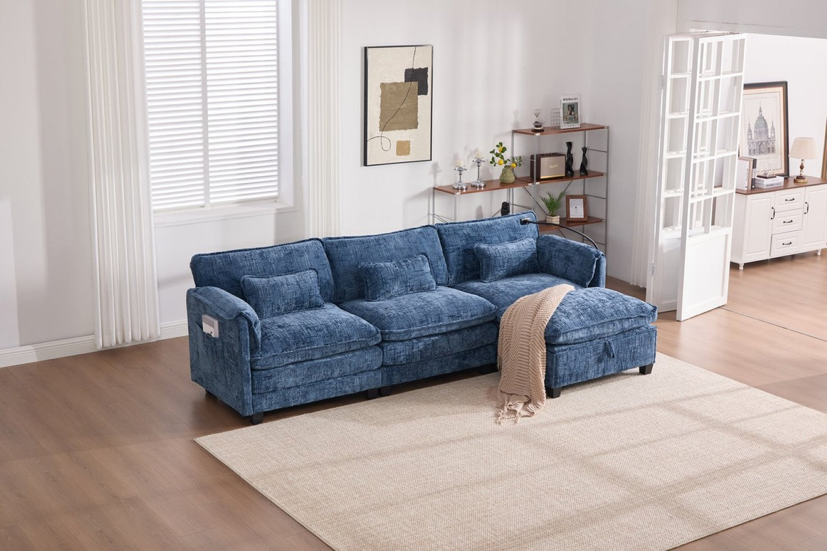 Enjoy movie nights, family gatherings, or solo relaxation with this oversized modular sectional designed for comfort, durability, and everyday convenience. Upholstered in soft, wear-resistant chenille, the sofa combines high-resilience foams, springs, and a solid wood frame to deliver long-lasting support. Thoughtful extras — a movable storage ottoman, dual side pockets, a detachable phone holder, and both USB and Type-C charging ports — keep essentials close and devices powered for uninterrupted leisure.