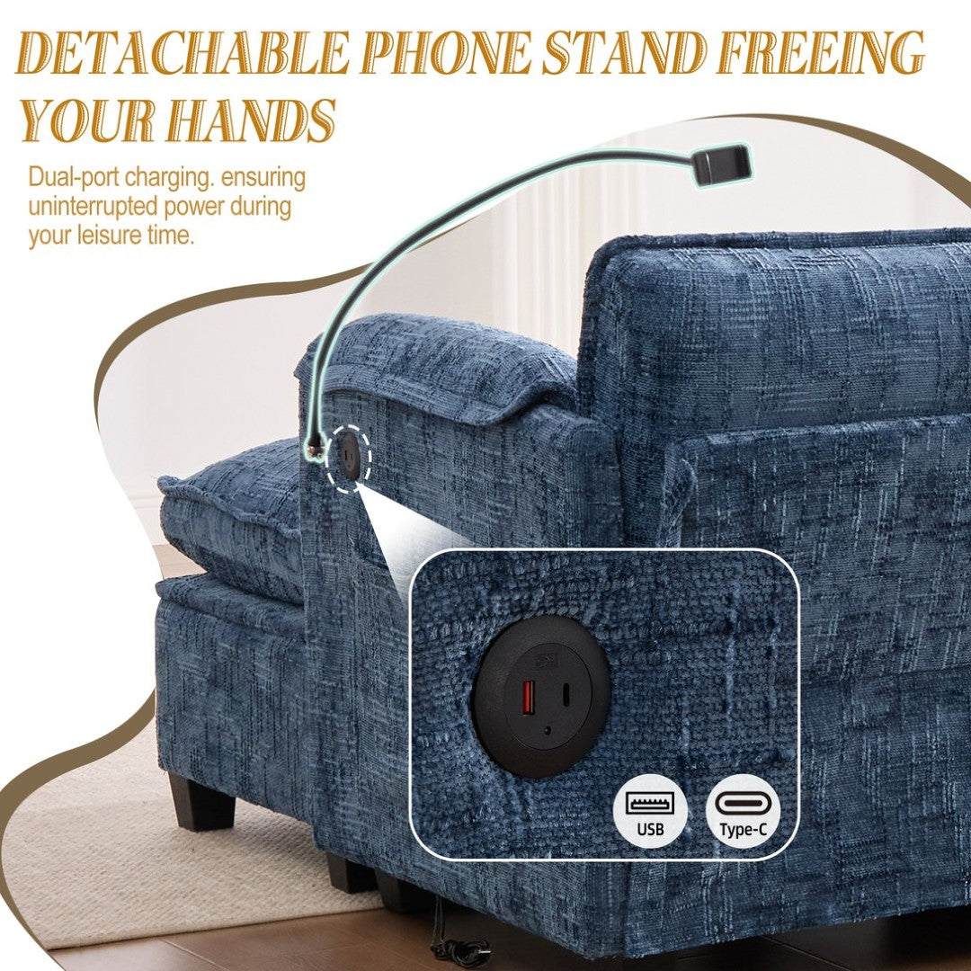 - Charging Ports and Phone Holder:The sofa is thoughtfully equipped with built-in charging interfaces: 1 USB port (5V-2.4A) + 1 Type-C port (5V-2.4A), and a phone holder. This design enables convenient charging of devices while keeping your phone within easy reach, perfectly integrating functionality with modern convenience to deliver a smarter living experience.