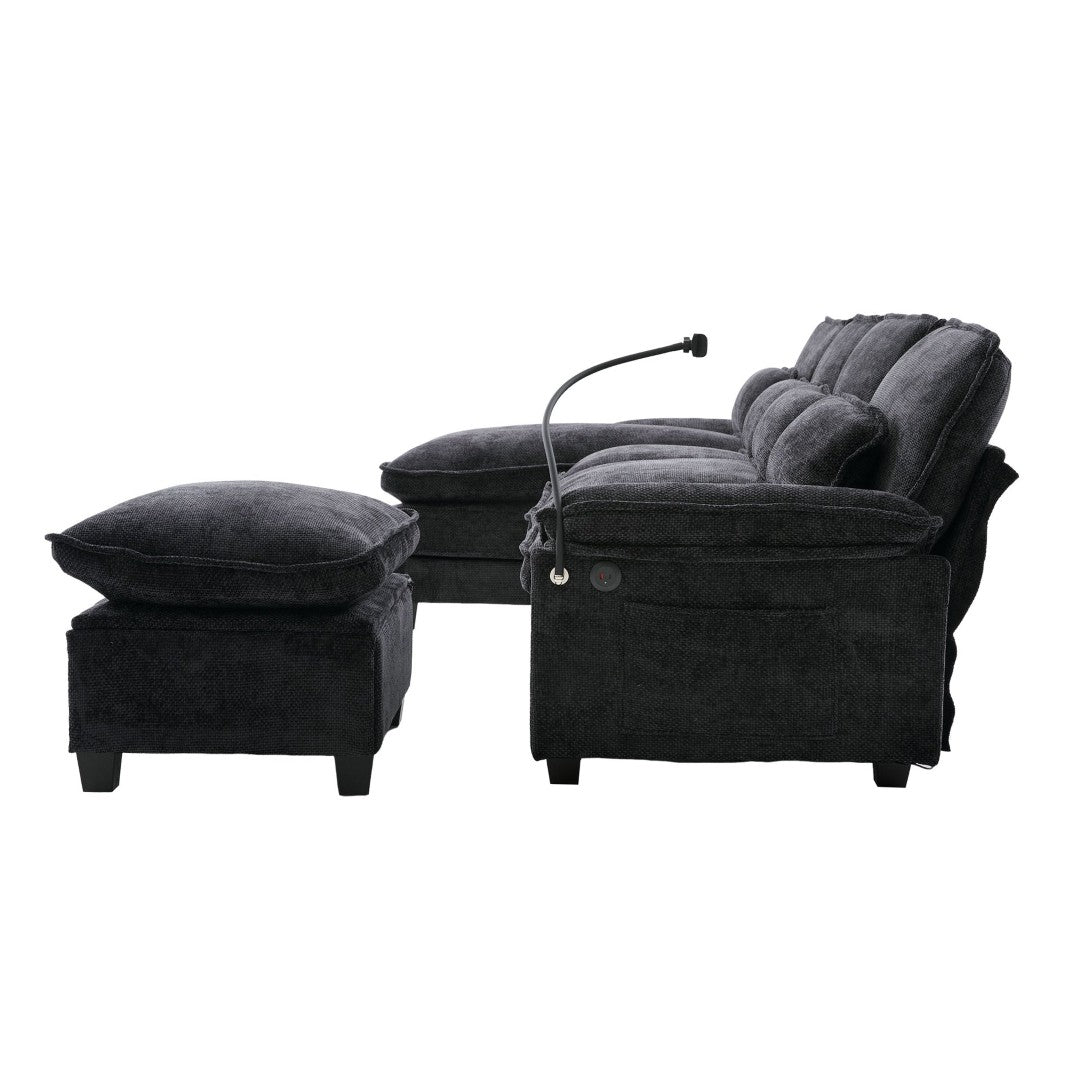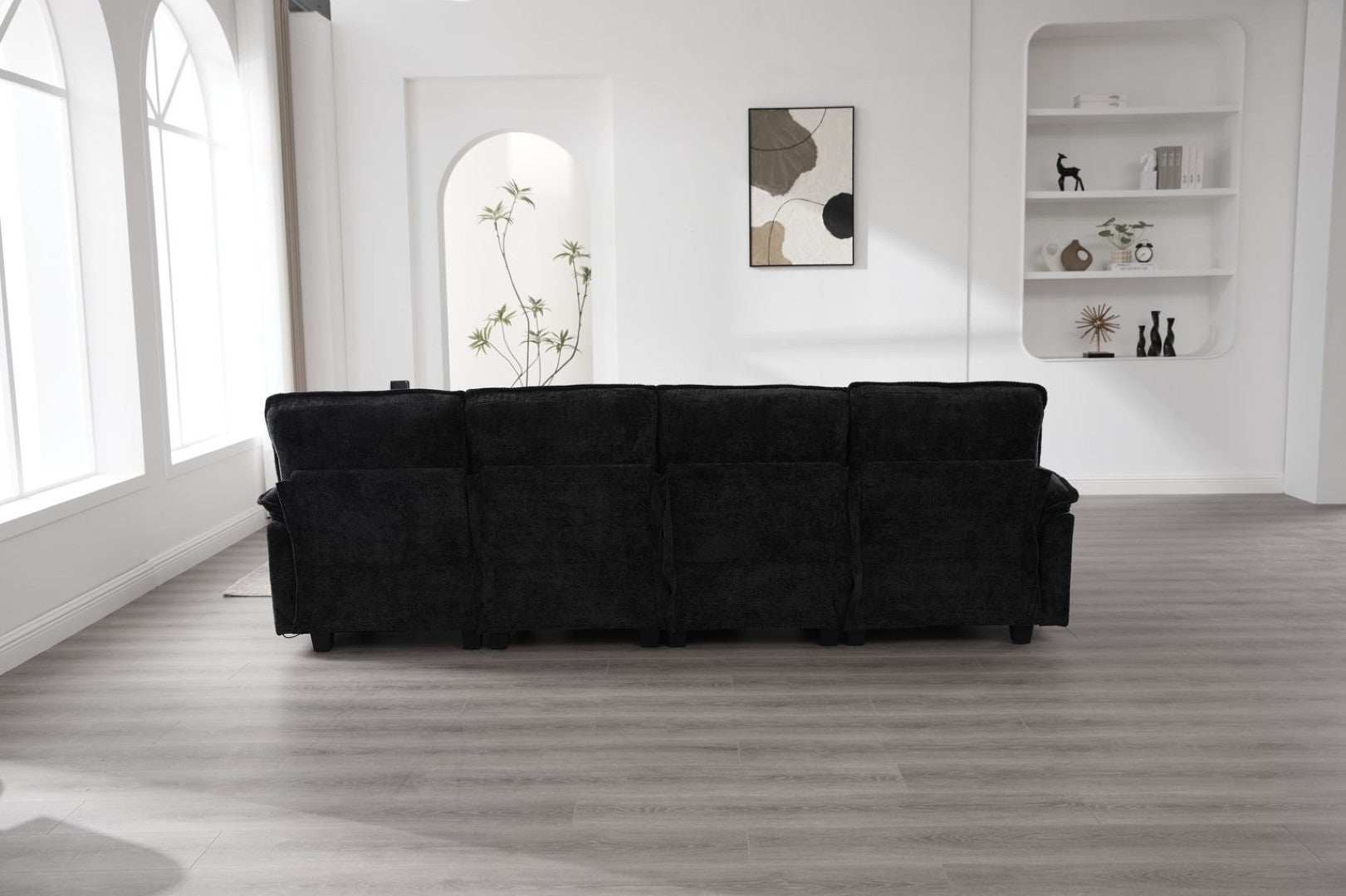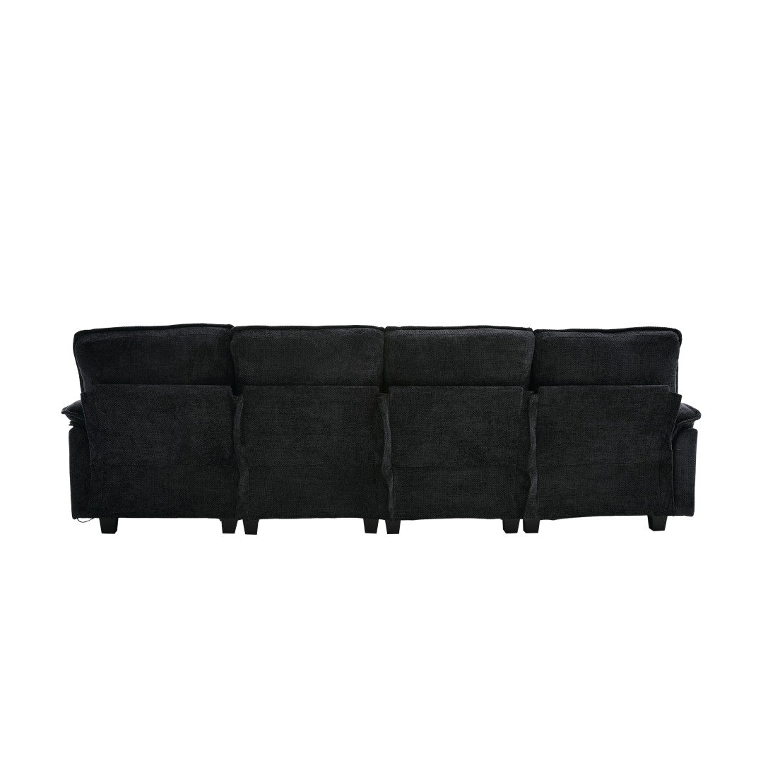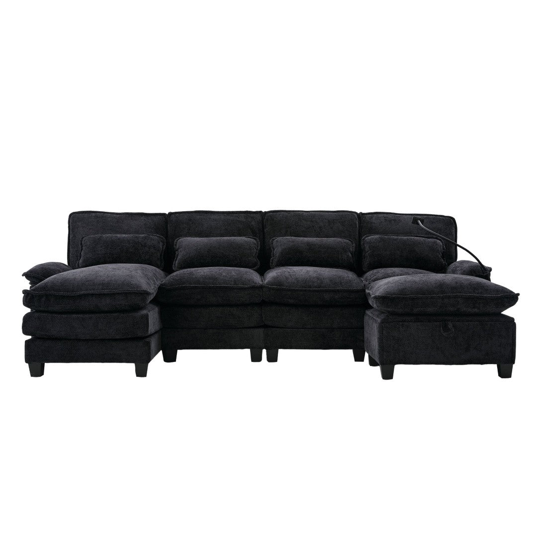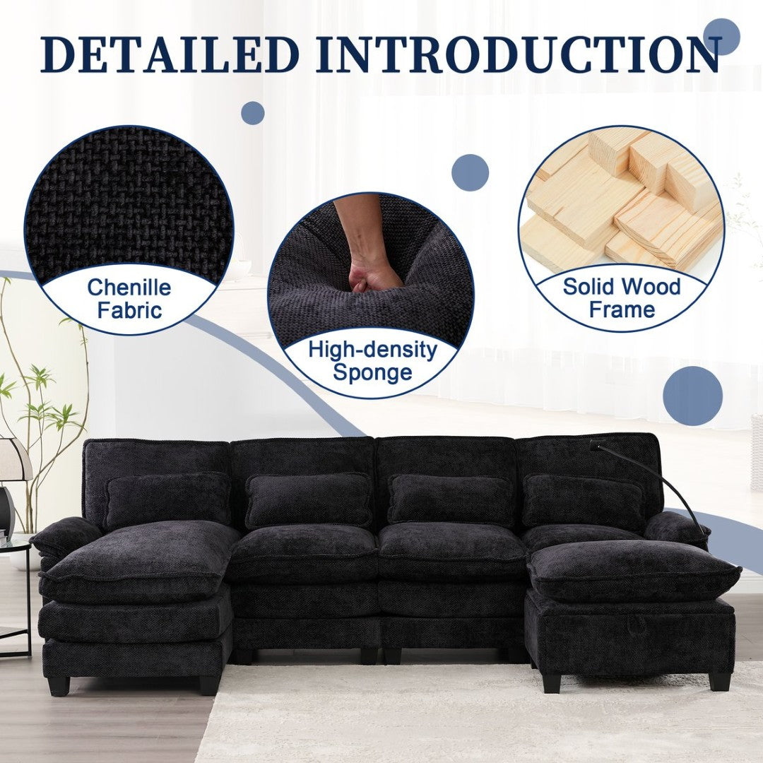 Experience roomy comfort and modern convenience with this U-shaped sectional designed for family living and stylish lounging. Upholstered in soft chenille with resilient double-layer cushions and a durable solid wood frame, it combines lasting support with thoughtful features — USB/Type-C ports, storage ottoman, and side pockets — for a clutter-free, connected living space.