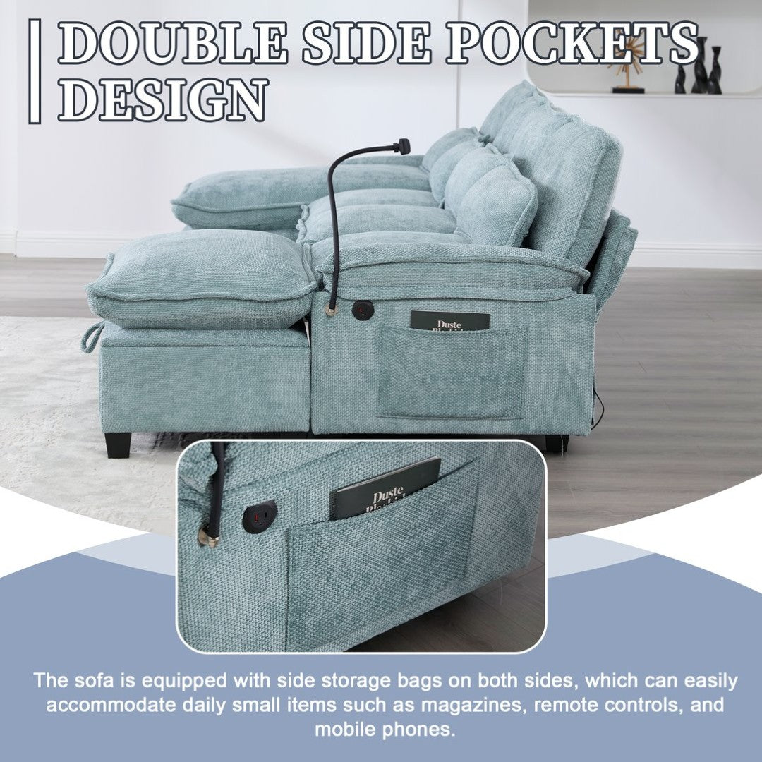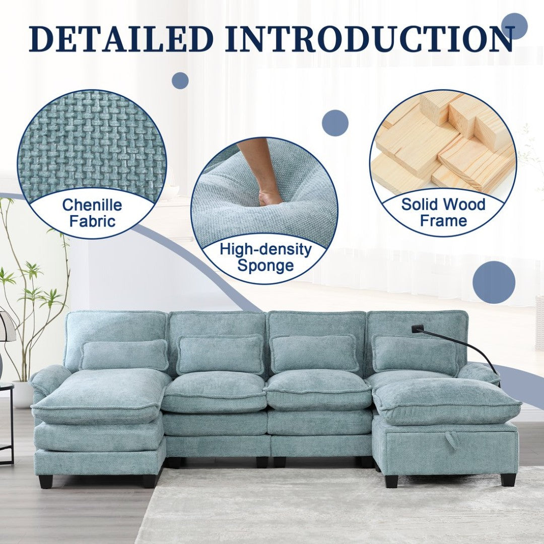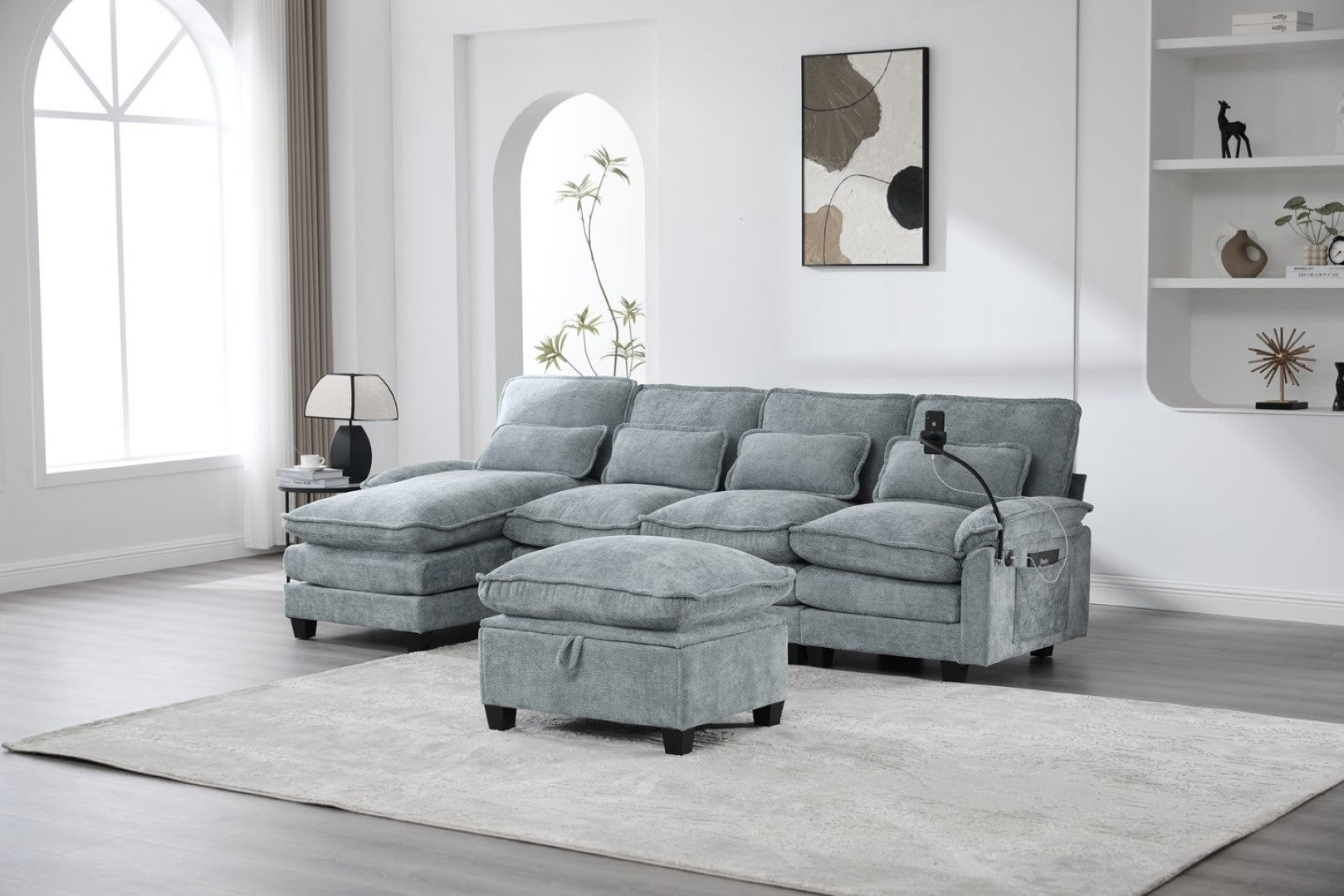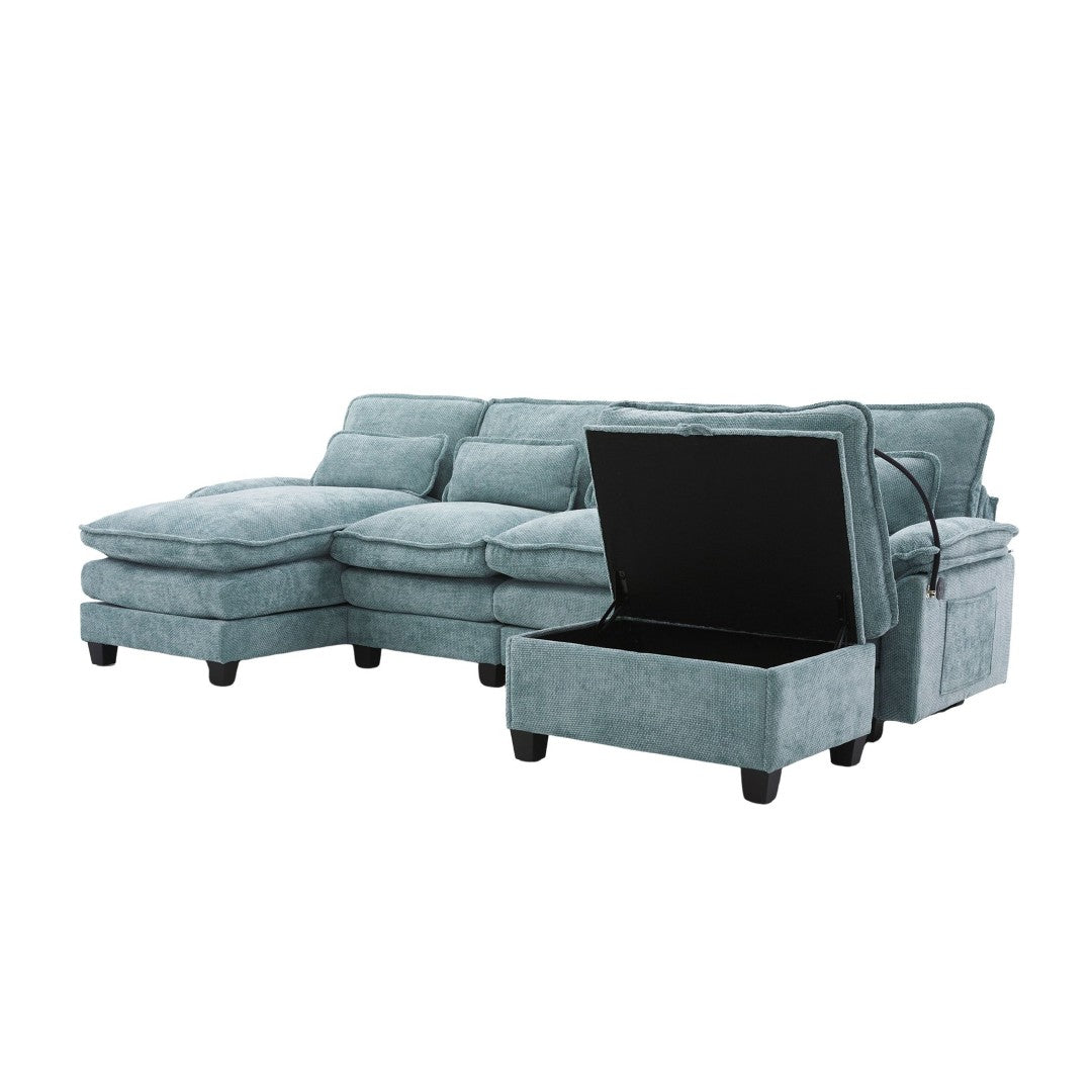 Experience roomy comfort and modern convenience with this U-shaped sectional designed for family living and stylish lounging. Upholstered in soft chenille with resilient double-layer cushions and a durable solid wood frame, it combines lasting support with thoughtful features — USB/Type-C ports, storage ottoman, and side pockets — for a clutter-free, connected living space.