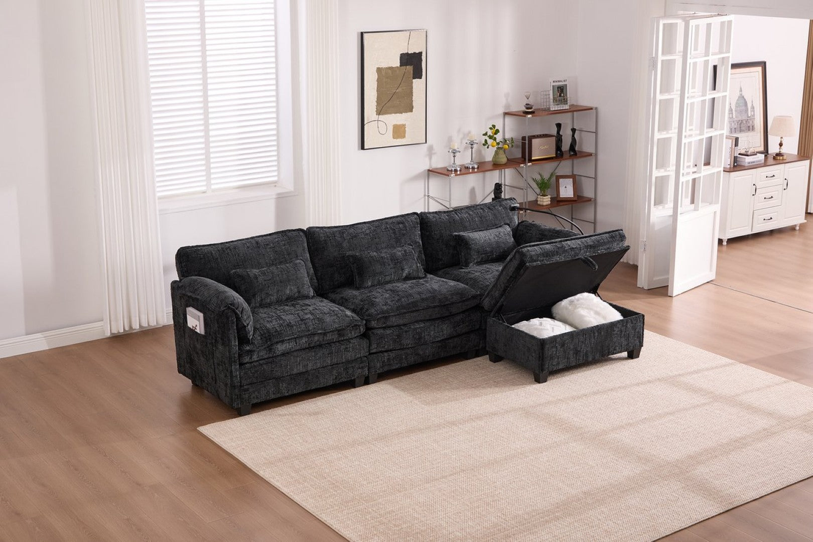- Movable storage ottoman: Flexible placement, flip-top compartment for blankets, pillows, magazines, and more — doubles as a footrest or extra seat.