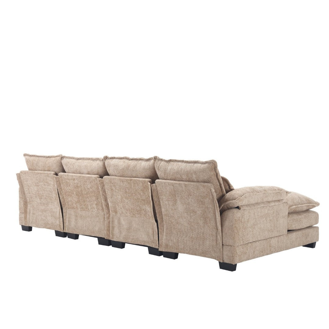 Experience spacious comfort and contemporary style with this oversized U-shaped sectional sofa. Upholstered in soft chenille/bouclé, it combines a durable solid-wood frame and high-density sponge cushions to deliver supportive seating for lounging, conversation, or meetings. Thoughtfully designed for apartment living, open-plan spaces, or conference rooms, this modular four-seater offers long-lasting comfort and clean modern lines that complement a variety of interiors.