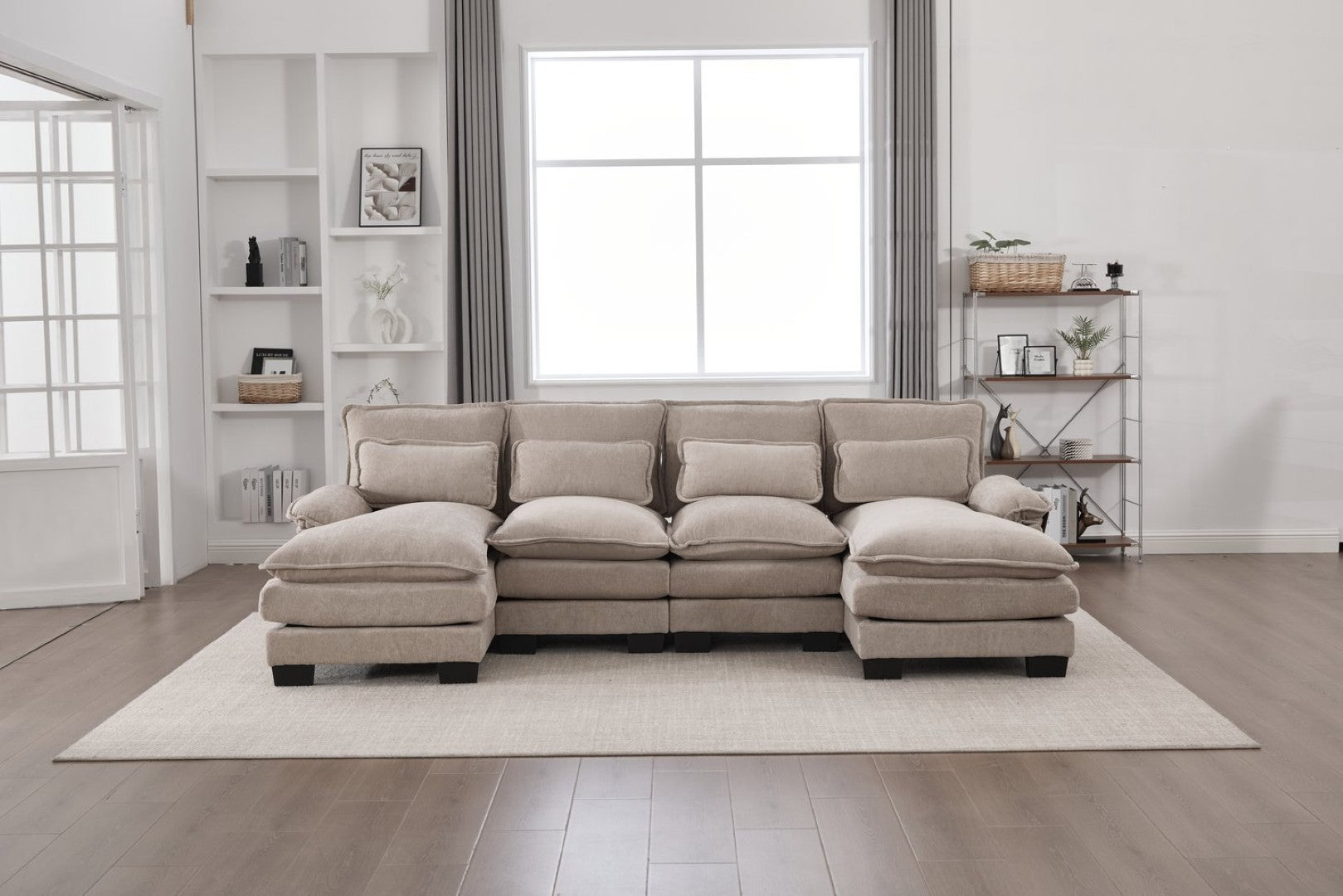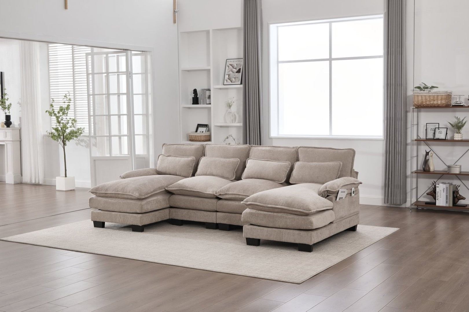 Sink into cloud-like comfort with this spacious U-shaped sectional designed for modern living. Plush chenille upholstery, memory-foam seating, and a double chaise layout create an inviting, lounge-ready centerpiece for family rooms, apartments, or open-plan spaces. Thoughtful details—like petal-shaped armrests, side storage pockets, and elevated legs—blend style with everyday practicality so your living area stays tidy and comfortable.