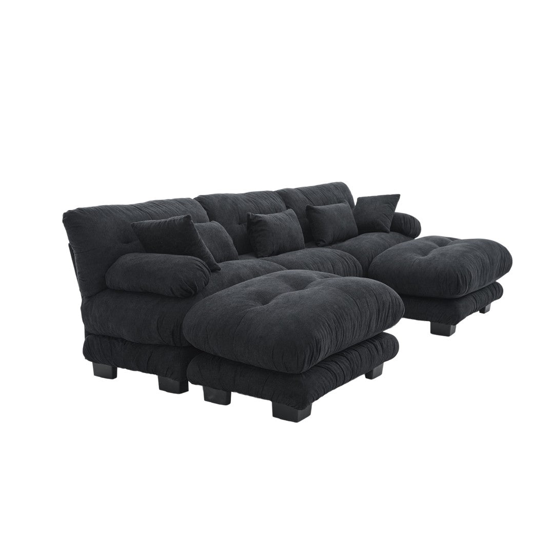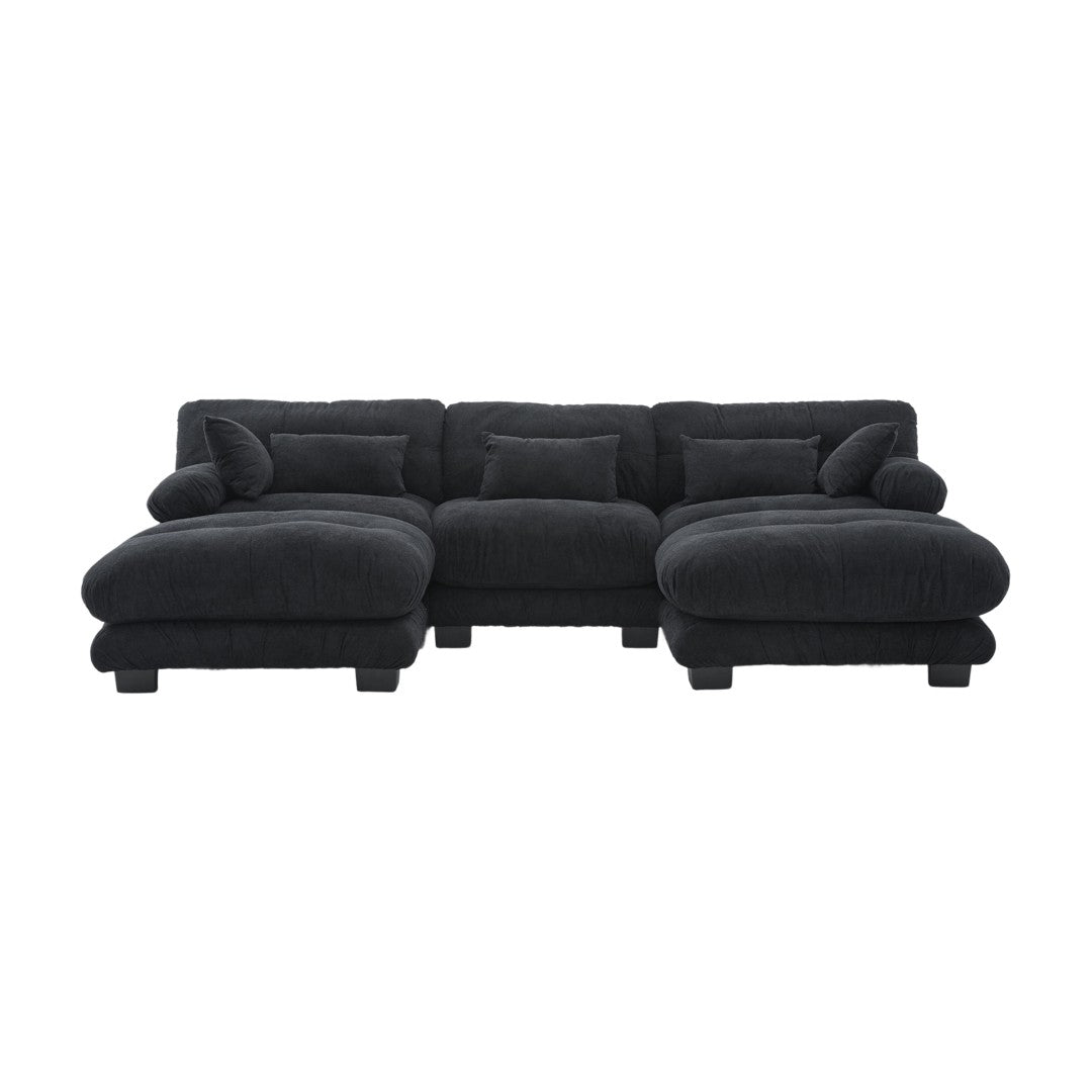 Transform your living space with this cloud-inspired U-shaped modular sofa—designed for exceptional comfort, supportive ergonomics, and flexible configuration. Plush pelletized velvet upholstery and rounded tufted cushions provide a soft, skin-friendly touch while a solid wood frame and high-density foam deliver long-lasting stability. Ideal for relaxing, entertaining, or easing the strain of long sitting, the set includes two ottomans and bolster lumbar pillows to create a cozy, posture-friendly seating area tailored to your room.