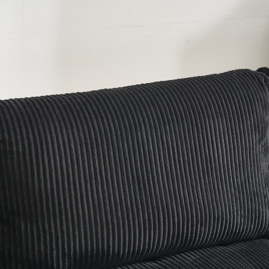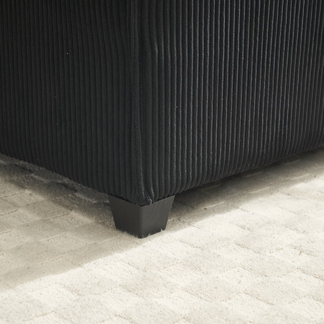 - Finish & Hardware: Black corduroy upholstery with plastic legs for stable floor support
