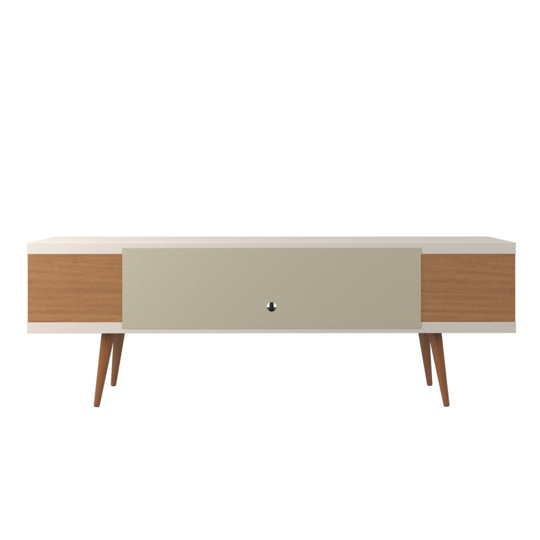Upgrade your living room with this elegant mid-century modern TV stand, finished in off-white and maple cream to brighten any space. Thoughtfully designed for both style and function, it supports large TVs while concealing media components and cords for a clean, organized entertainment area.