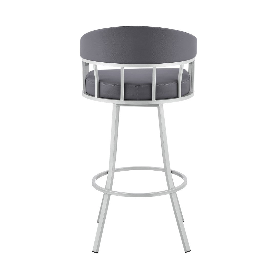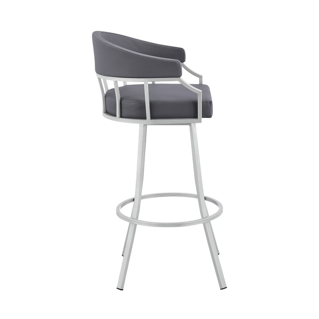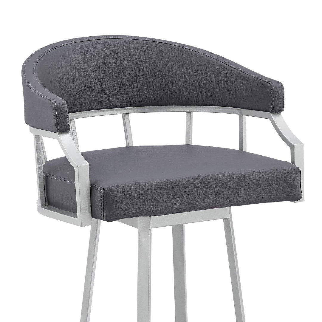 Bring modern comfort and durable construction to your kitchen, home bar, or dining nook with the Velisse swivel bar stool. Upholstered in soft slate-gray faux leather and supported by a four-leg metal base with a supportive ring footrest, this stool blends contemporary style with everyday practicality — including a full 360° swivel for easy conversation and service.