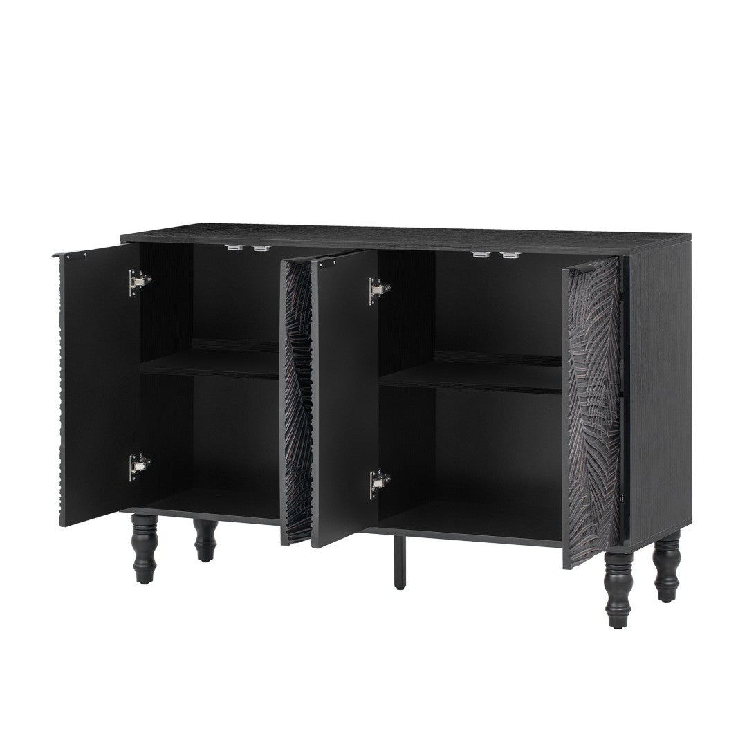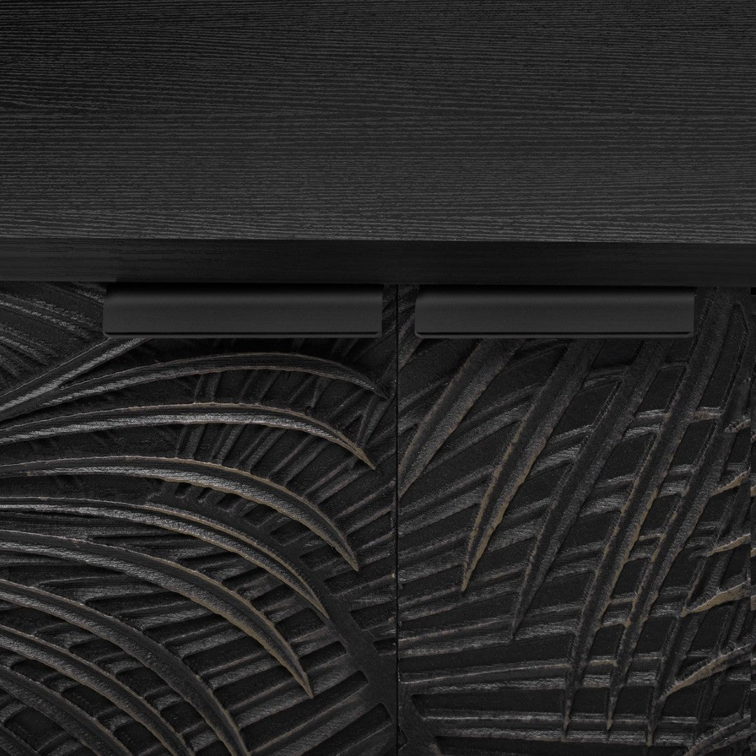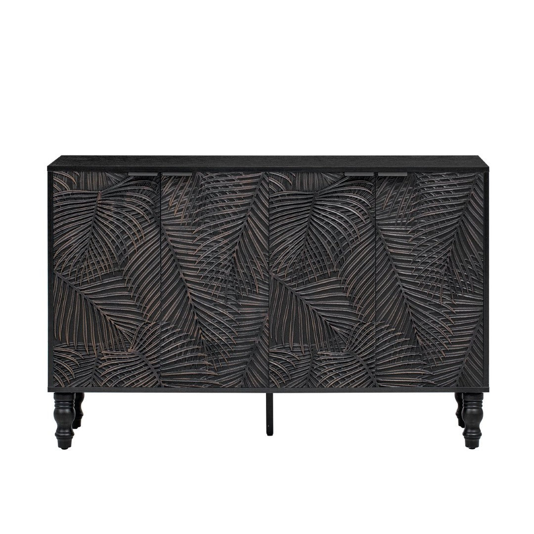Give your living room or bedroom a fresh, modern focal point with this stylish media console that blends clean contemporary lines with natural wood accents. Thoughtful details — like carved leaf-pattern doors, tapered solid wood legs, and refined metal handles — elevate both form and function. Designed for everyday use, the console offers flexible storage, sturdy construction, and safety features to keep your entertainment area organized and secure.