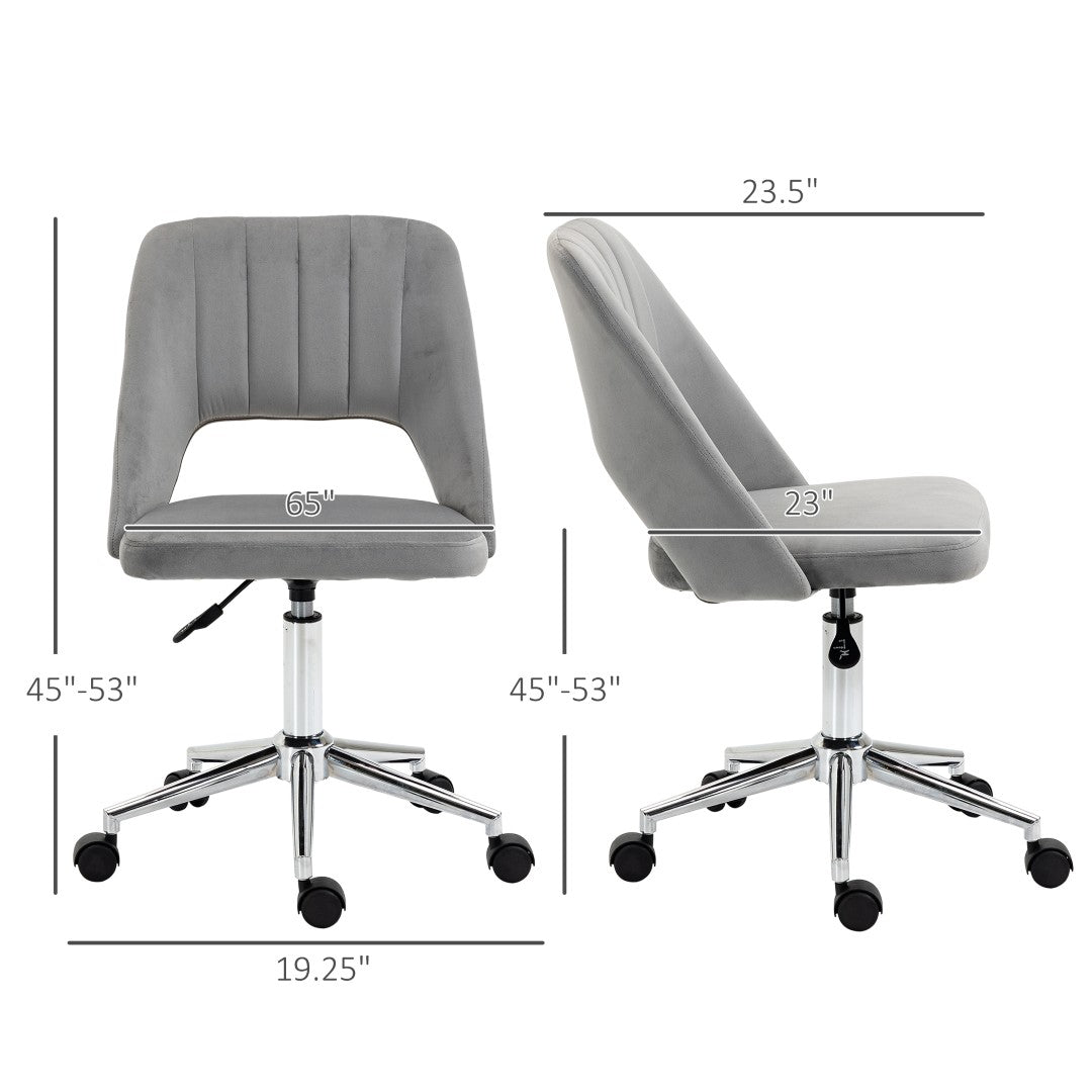 Bring comfort and contemporary style to your home office with this mid-back velvet desk chair. Upholstered in soft grey polyester velvet and padded with thick foam, it blends supportive seating with a sleek hollow-back silhouette. The armless, space-saving design and smooth 360° swivel make it ideal for compact workspaces, while height adjustability ensures a personalized fit for long work or study sessions.