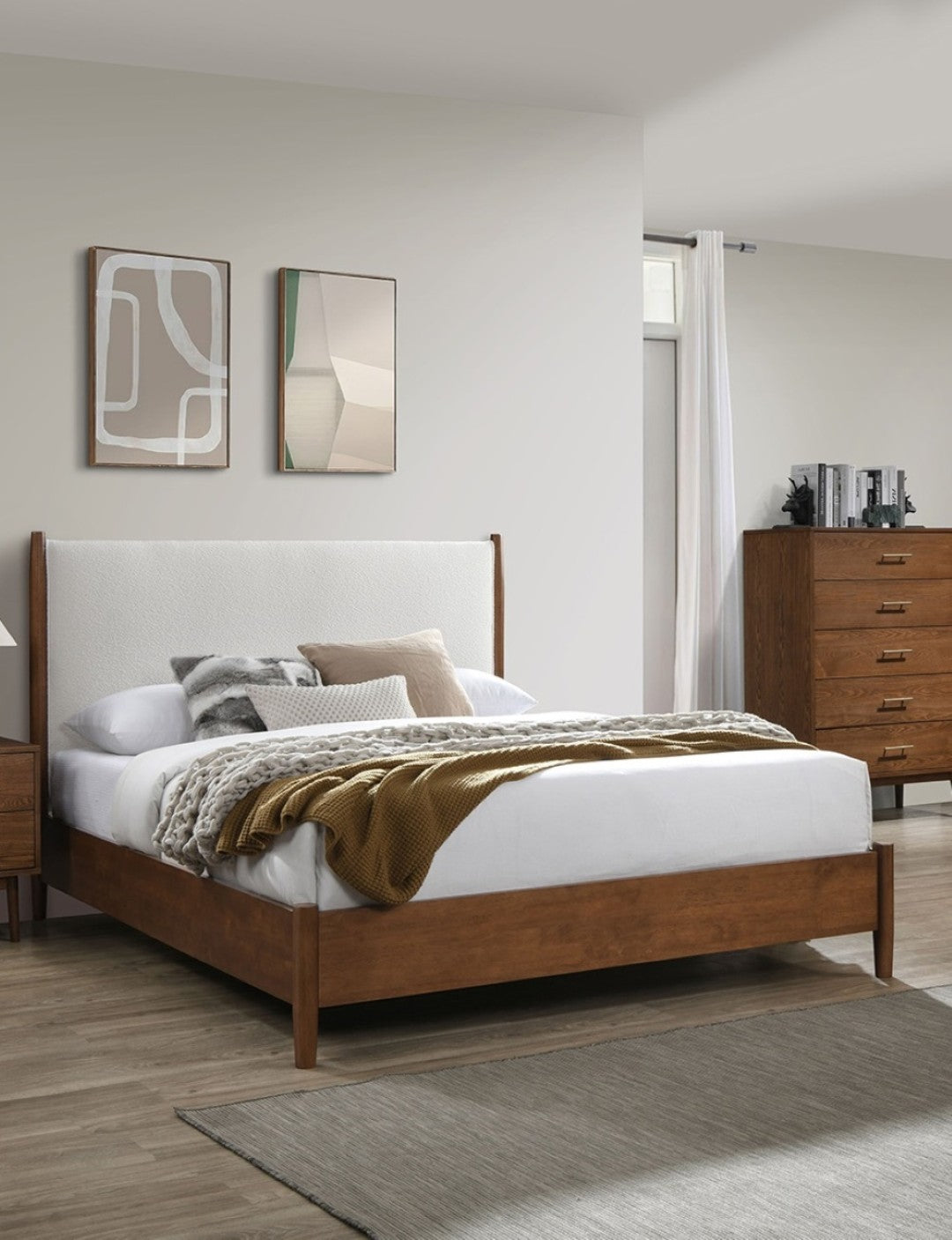 - Headboard: Beige boucle/upholstered fabric panel headboard for added comfort and visual warmth.