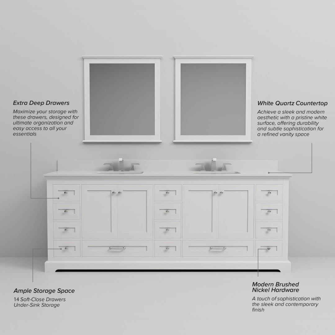 Elevate your bathroom with this elegant white double vanity that combines generous storage, durable surfaces, and a coordinated faucet set for a complete, polished look. Designed for both style and function, it offers ample organization for busy households while the quartz top and soft-close hardware ensure lasting performance and a quiet, premium experience.