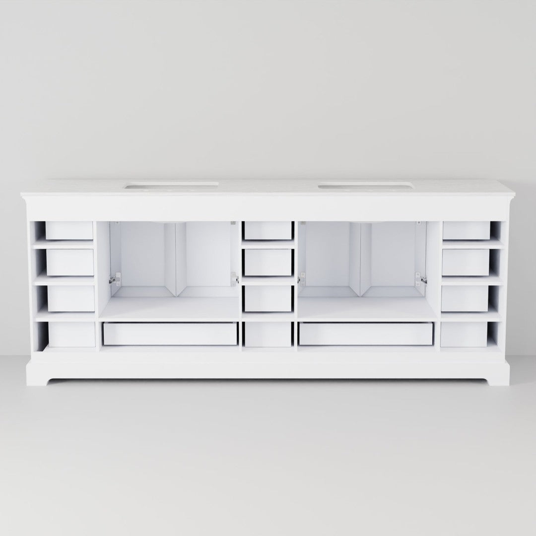 - Storage Configuration: Two interior cabinets, fourteen drawers, and an open cabinet shelf provide extensive, organized storage for toiletries, linens, and accessories