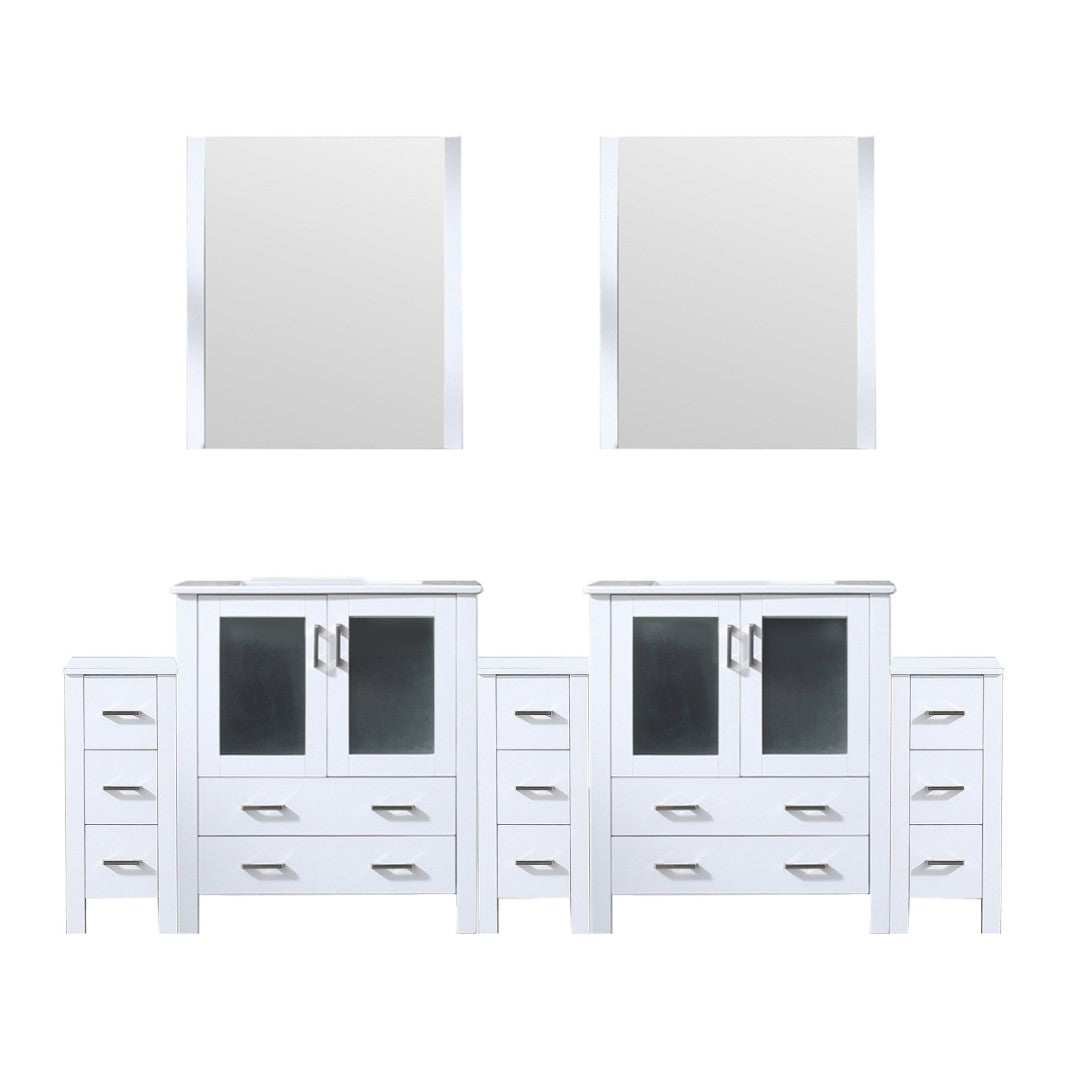 - Mirrors included: Two rectangular mirrors, each 28 in. W x 32 in. H, sized to complement the double-sink layout