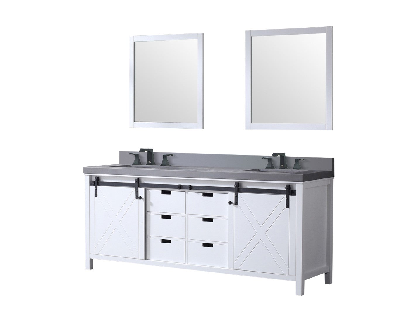 Create a refined, functional centerpiece for your bathroom with this white double vanity set. Designed for durability and style, it combines generous storage, a scratch- and stain-resistant grey quartz countertop, coordinated matte black faucets, and matching mirrors to deliver a cohesive, high-end look for a busy master bath.