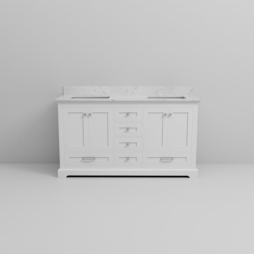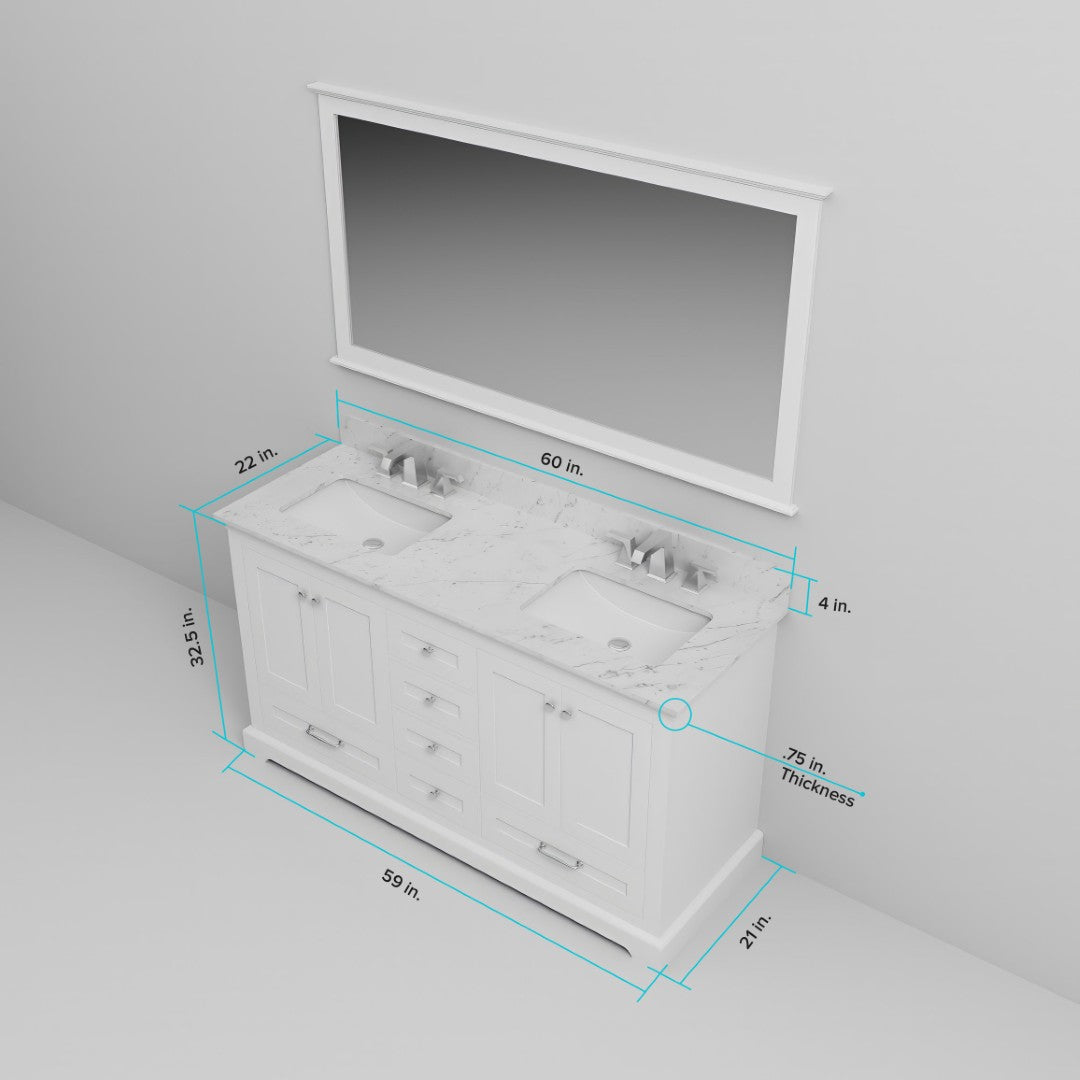 - Overall size: 60 in. W x 22 in. D cabinet footprint with matching Carrara marble top
